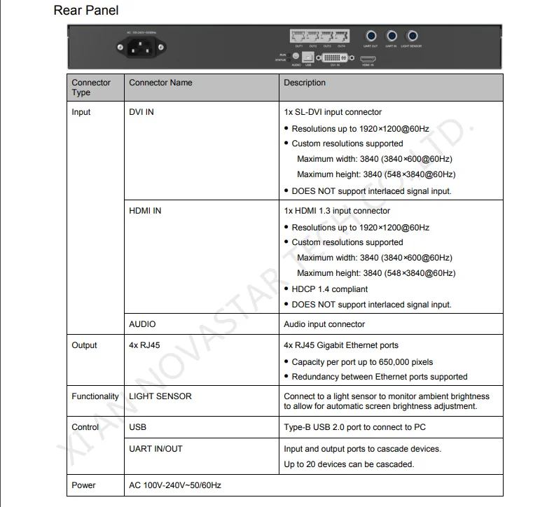 1) Вход HDMI/DVI; 2) HDMI/внешний аудио вход; 3) 12 бит/10 бит/8 бит HD видео источника; 4) Поддерживаемое разрешение: 2048 × 1152,1920 × 1200,2560 × 960; 5) Поддерживаемое разрешение: 1440 × 900 (12 бит/10 бит); 6) 1 светильник с сенсором; 7) поддержка каскада; 8) обработка и презентация 18-битных серых шкал; 9) Формат видео: RGB, YCrCb4:2:2, YCrCb4:4:4; 10) стандартный корпус 1U и независимый источник питания.