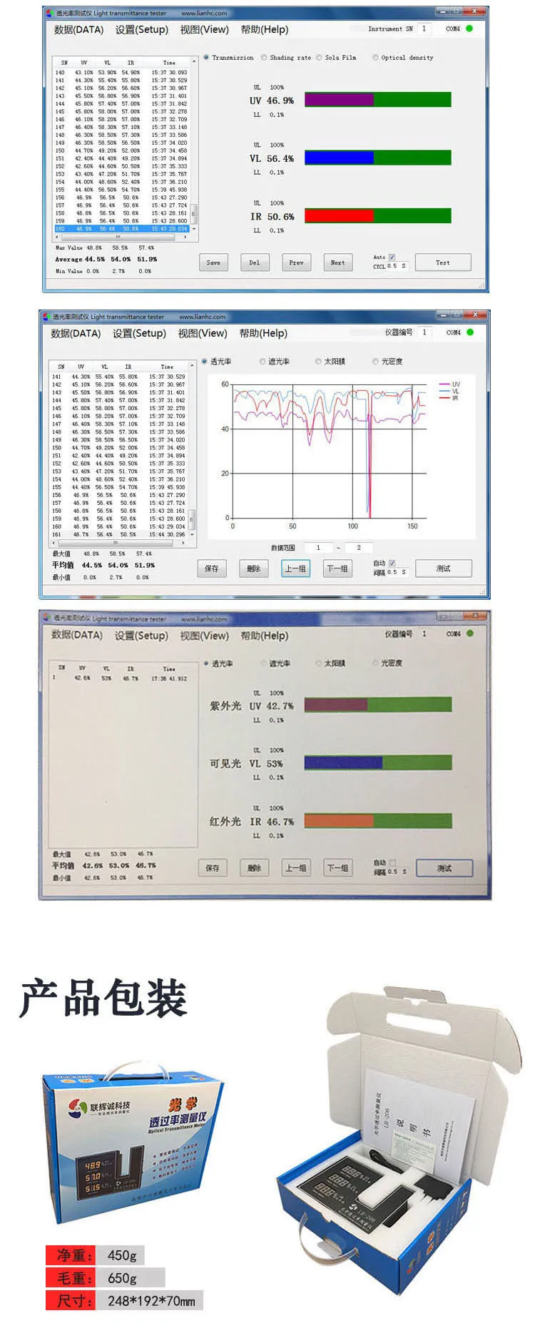 1. UV, visible light, infrared light three-band transmittance, shading rate / barrier rate test 2. Measuring thickness ≤ 0.5mm; 3. Suitable for thin materials such as solar film, agricultural film, PVC, PC, etc. 4. Not suitable for frosting, haze, non-transparent measurement 5. Not suitable for glass, the thickness of glass is generally more than 0.5mm NOTE: Please note that this product does not contain a lithium battery.
