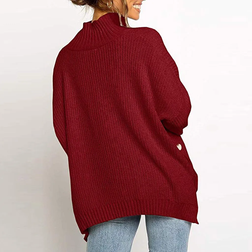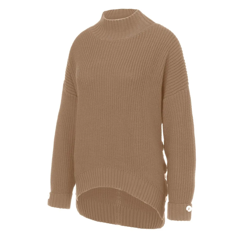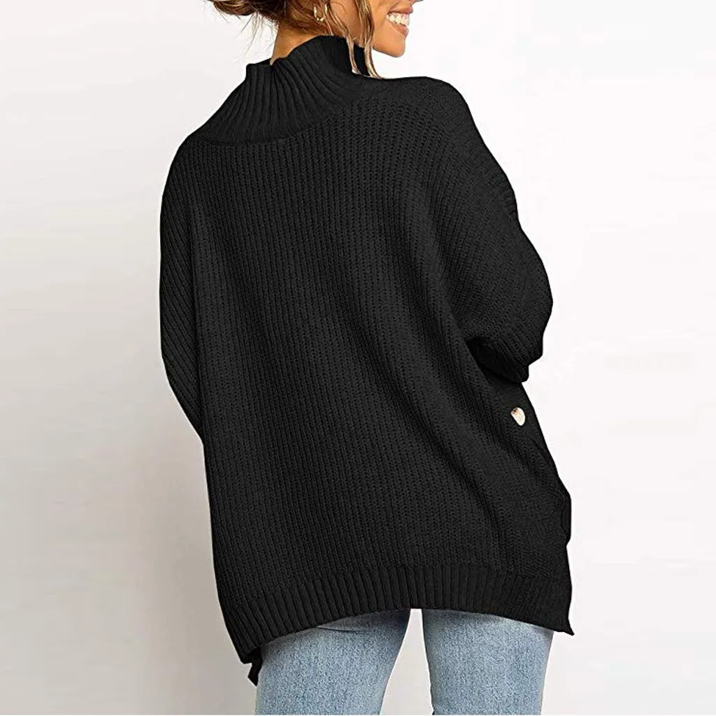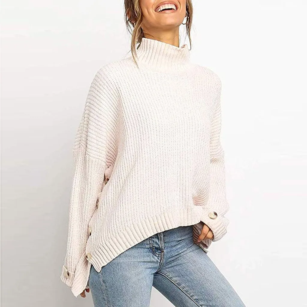 Fashion Women Button Irregular Solid Long Sleeve Turtleneck Knitted Sweater Top