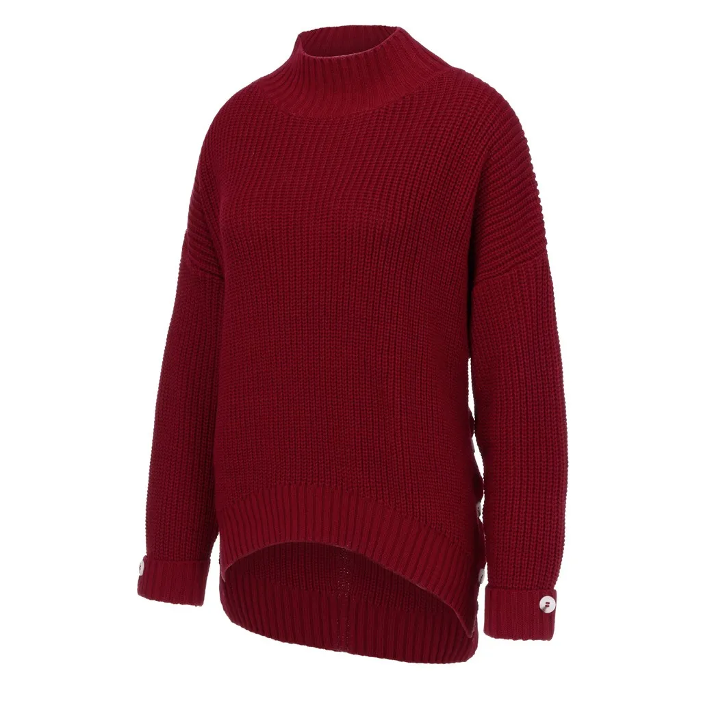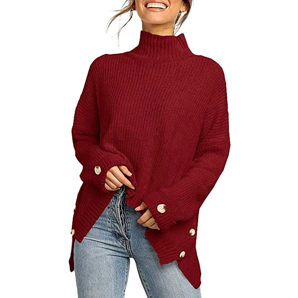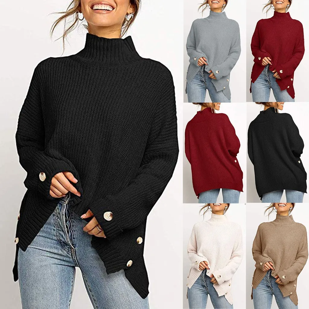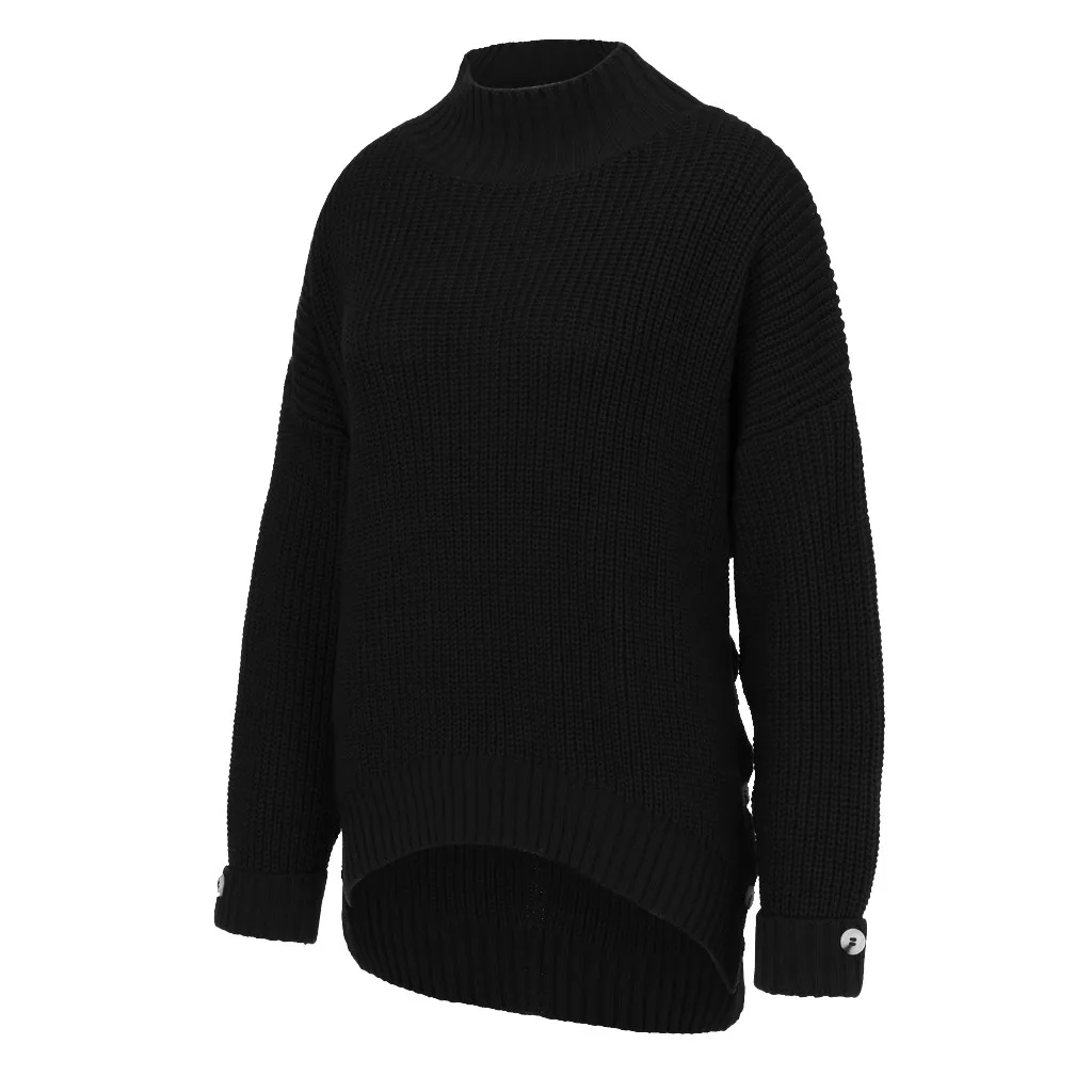 Fashion Women Button Irregular Solid Long Sleeve Turtleneck Knitted Sweater Top