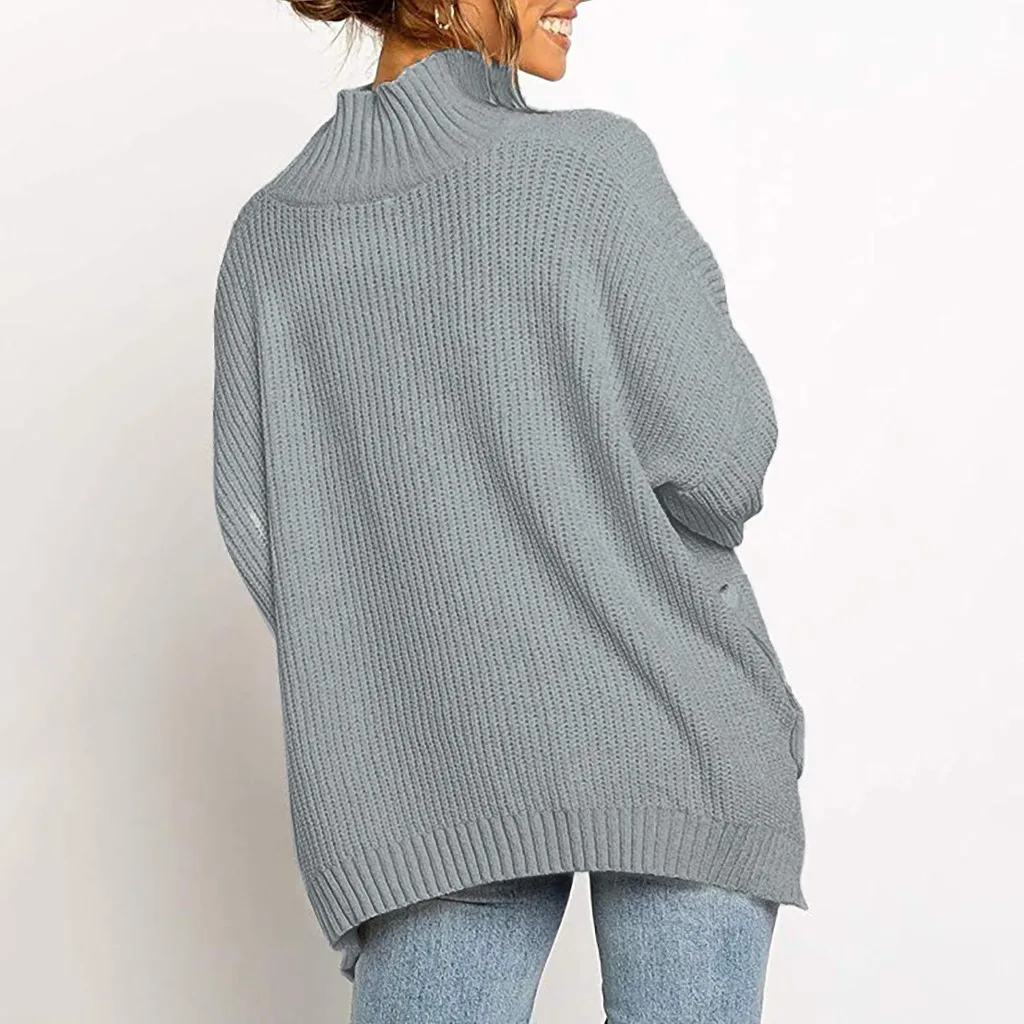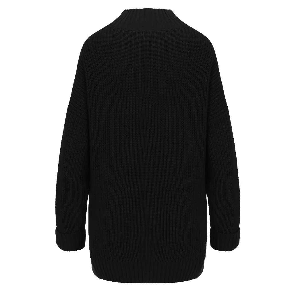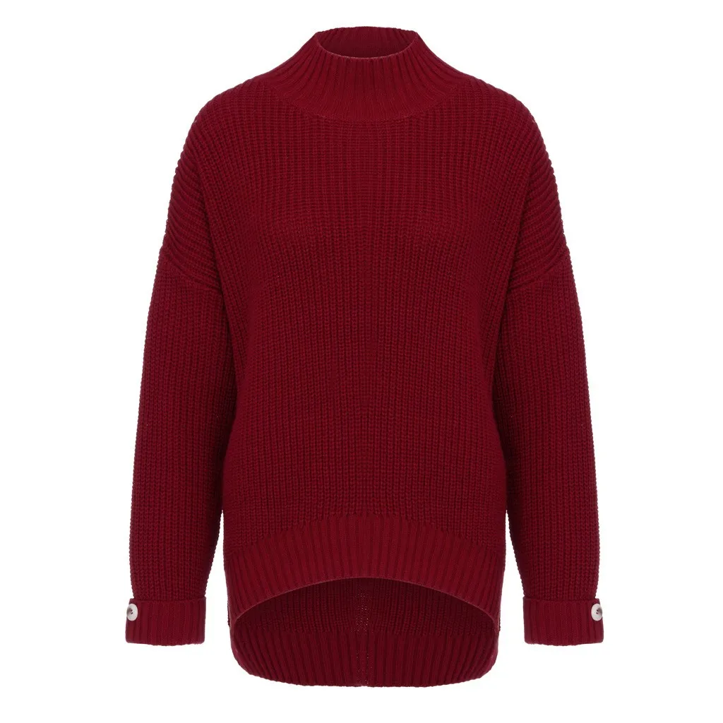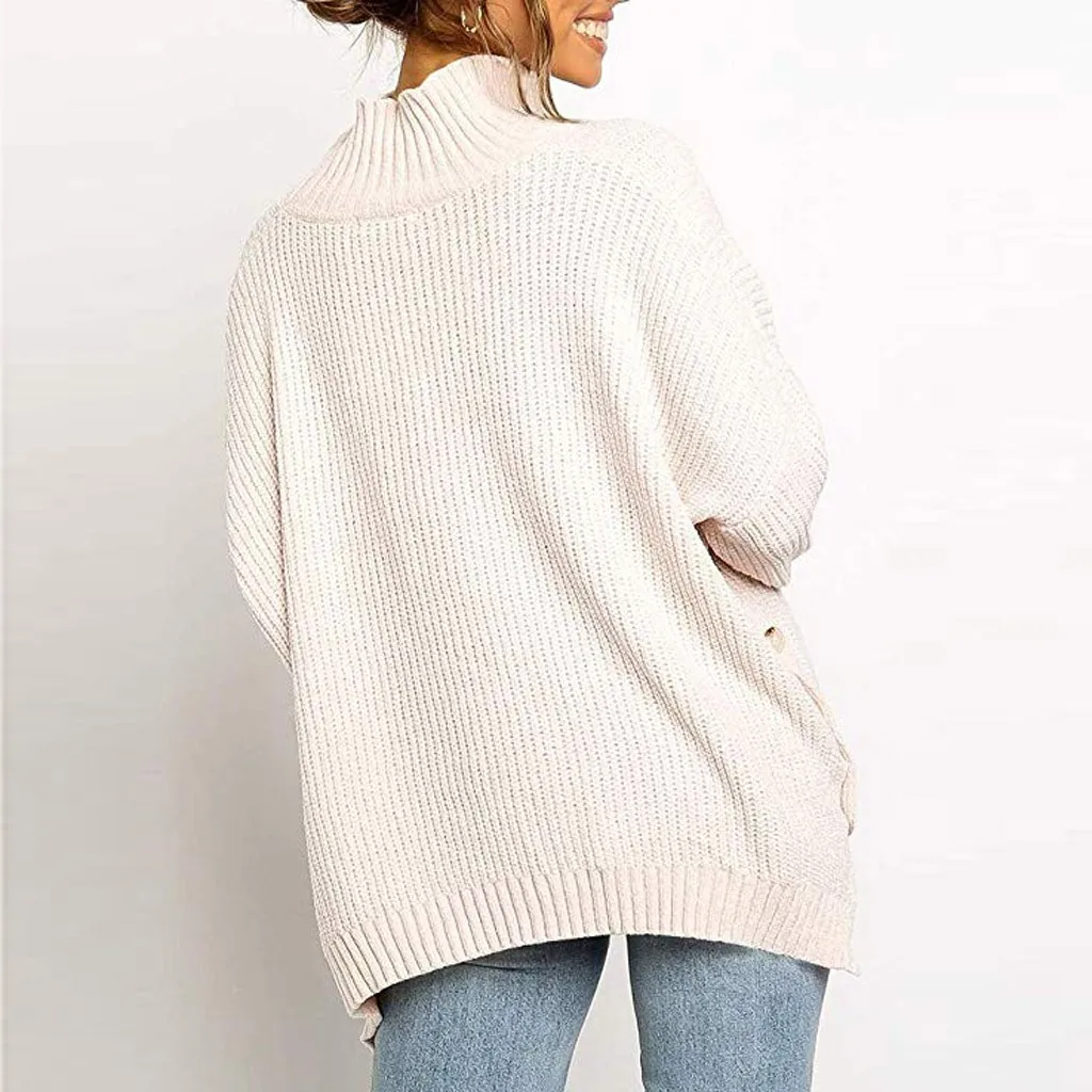 Fashion Women Button Irregular Solid Long Sleeve Turtleneck Knitted Sweater Top