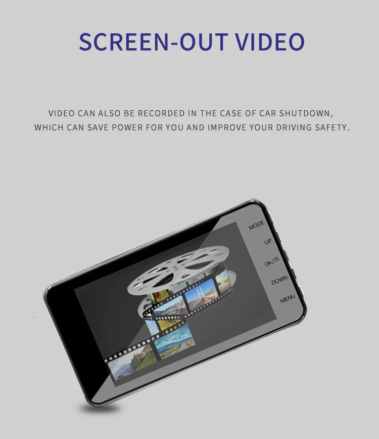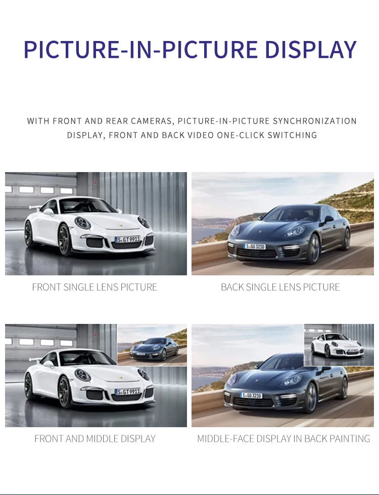 Packaged included: 1x Car DVR 1x Car Charger 1x Rearview camera 1x Rearview camera line(about 6m) 2x Screws 1x Suction Bracket 1x User Manual Specifications: Camera: Quality ABS Texture View of Angle: 170°wide angle Maximum video resolution: 1080FHD (1920 x1080) Video Format: . PAL/NTSC Photo Format: JPEG Camera mode: 1200M Support SD card: Micro SD card, class10 or above, Maximum support 32GB(not included) Dual record:off/on Interval record:off/100ms/200ms/500ms High dynamic range: on/off Exposure:+-2,+-5/3,+-4/3,+-1,+-2/3,+-1/3,0 Motion detection: on/off Recording: on/off Date stamp:off/on Gravity sensing: off/high/medium/low Parking guard:on/off Car number: on/off LCD brightness:off/30second/1minute/2minutes Auto power off: off/3min/5min/10min Frequency: 50HZ/60HZ Beep sound: on/off Fill light: on/off Features: -Low illumination high-definition video , dual camera 1080P&720P,the front camera is Full HD 1080P(1920*1080),the rear view camera is 720P -The built-in low illumination high previous to light 170° wide angel lens, was made by 6 layers of A+ high transmittance glass, add a variety of intelligent processing technology, extreme image,dual camera with all glass -4 inch IPS HD display screen, 2.5D glass surface, more noble and rare. -Support night vision,one LED light can let it record clear video in low light condition,as is clearly visible at night -Support “Picture in Picture”,two camera can display on the screen simultaneously -Support G-sensor, automatically recording video and lock file when accident occurred, is the best evidence for you -High sensitivity parking monitoring -Support loop recording -Support reversing video camera, connect the red line of rear view camera to the anode of reversing lights. Insert the car charger, machine will automatically start recording, when your car switch to R position ,it will switch to reverse image automatically -HDR--High Dynamic Range image processing -The u ltimate video processing ensuring you can record and view clearly on the brightest day and darkest night -Impact sensitivity adjustment automatically lock file -Drive start simultaneously -The biggest support 32 GB TF card (access speed class 6 or above ,card not included) -Can charge while video -Image monitor the real-time recording output -USB Function, connect to computer by USB cable ,in the massage mode, you can access video files and photo files ,in the PC-camera mode, you can take photo or make video chat -Mainly powered by car charge, automatically turns off to protect the battery when it’s down -Easy to install with the help of 3 meter adhesive bracket,perfect h idden installation,don’t block the line of sight -Short press the up key to switch camera, short press the mode key to lock file