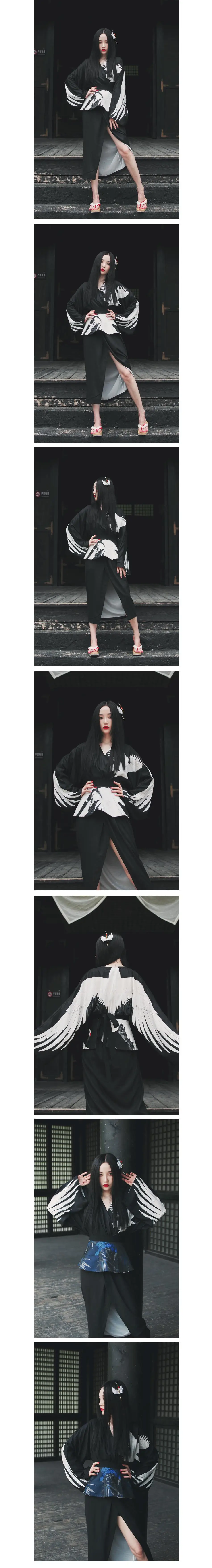 Женское длинное платье в японском стиле, черное свободное платье с принтом журавлей и V-образным вырезом, длинное платье с регулируемой талией и разрезом, 2020