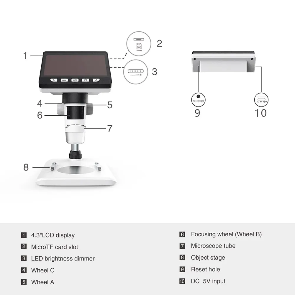 Он реализует full HD, высокое расстояние объекта, многофункциональный, мульти-выход одновременно. И дизайн внешнего вида сочетает в себе более эргономичный подход, обеспечивает пользователю лучший опыт. Особенности: Со встроенной литиевой батареей, может работать непрерывно в течение 4 часов. 4,3 дюймов HD ЖК-дисплей дисплей, с помощью которой удобно наблюдать за более подробных деталей. Поддерживаемые языки: английский, немецкий, французский, испанский, итальянский, японский, традиционный китайский, упрощенный китайский, португальский, корейский. 8 регулируемый светодиодный светильник высокой яркости может работать до 100 тысяч часов, что обеспечивает длительный срок службы. Поддержка вставки карты памяти для съемки фотографий и видео для совместного использования сети и экономии компьютера. Стойка очень устойчива, и вам не придется беспокоиться о тряске снаружи. Широкое применение: ремонт доски, проверка печати, проверка денег, обучение и исследование, наблюдение за насекомыми, идентификация ювелирных изделий. Двойной режим питания, литиевая батарея используется для источника питания или подключен к источнику питания. Характеристики: Материал: металл + пластик Основной цвет: черный Датчик изображения: 2 м хорошее качество датчик изображения Увеличение: 50x, 1000x Дисплей: 4,3 дюймов TFT ЖК панель, 16:9 Диапазон фокусировки: 0-40 мм Режим Foucus: руководство Разрешение: 1920*1080, 1280*960, 640*480 Слот для карт Micro TF: Поддержка карт Micro TF (не оснащенных этим устройством) до 32 Гб, включая FAT, FAT32 два формата файлов Формат данных: JPG/AVI Светильник источник света: 8 Светодиодный светильник s (регулируемая яркость) Частота кадров: 30 кадров в секунду Интерфейс: USB2.0 Структура линз: 2G + IR Диафрагма: F4.5 Угол объектива: 16 ° Мощность питания: 1 * литиевая батарея, 3,7 V, 1500 мА · ч (входит в комплект) Источник питания: 5 В постоянного тока Номинальное напряжение: 110-240 В переменного тока Время непрерывной работы батареи: около 4 часов Время зарядки: около 4 часов Размер стенда: 156*122 мм/6,1 * 4.8in Размер посылка: 210*210*135 мм/8,3*8,3*5,3 дюйма Посылка Вес: 714 г/1.6lb Посылка: 1 * ЖК-цифровой микроскоп 1 * USB кабель для передачи данных 2 * ломтик 1 * ткань для чистки 1 * Руководство пользователя