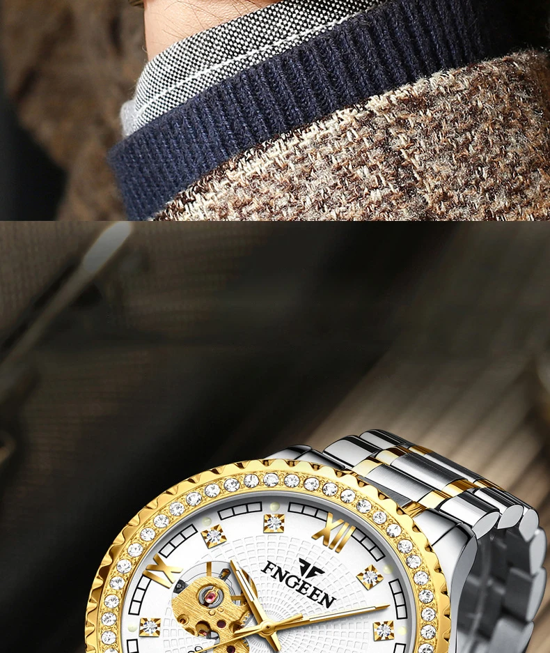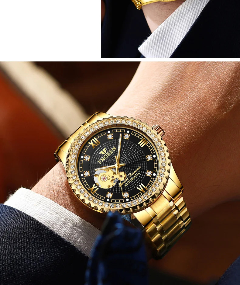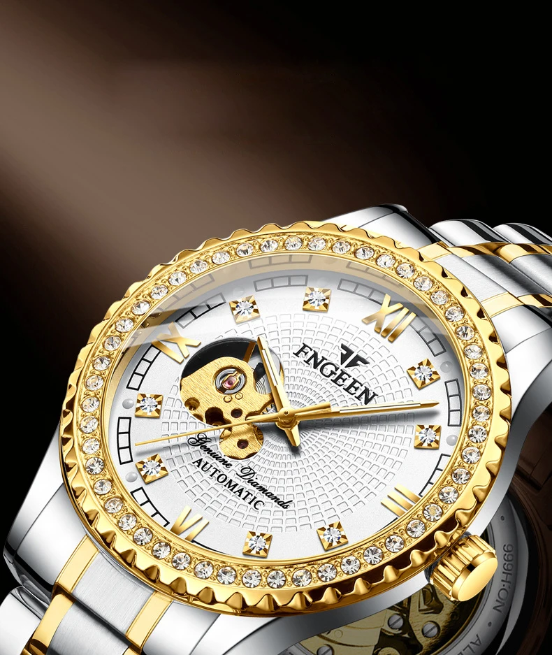 Механические часы для мужчин, самовзводные Автоматические наручные часы с бриллиантовым циферблатом, светящиеся водонепроницаемые часы, золотые мужские часы со скелетом