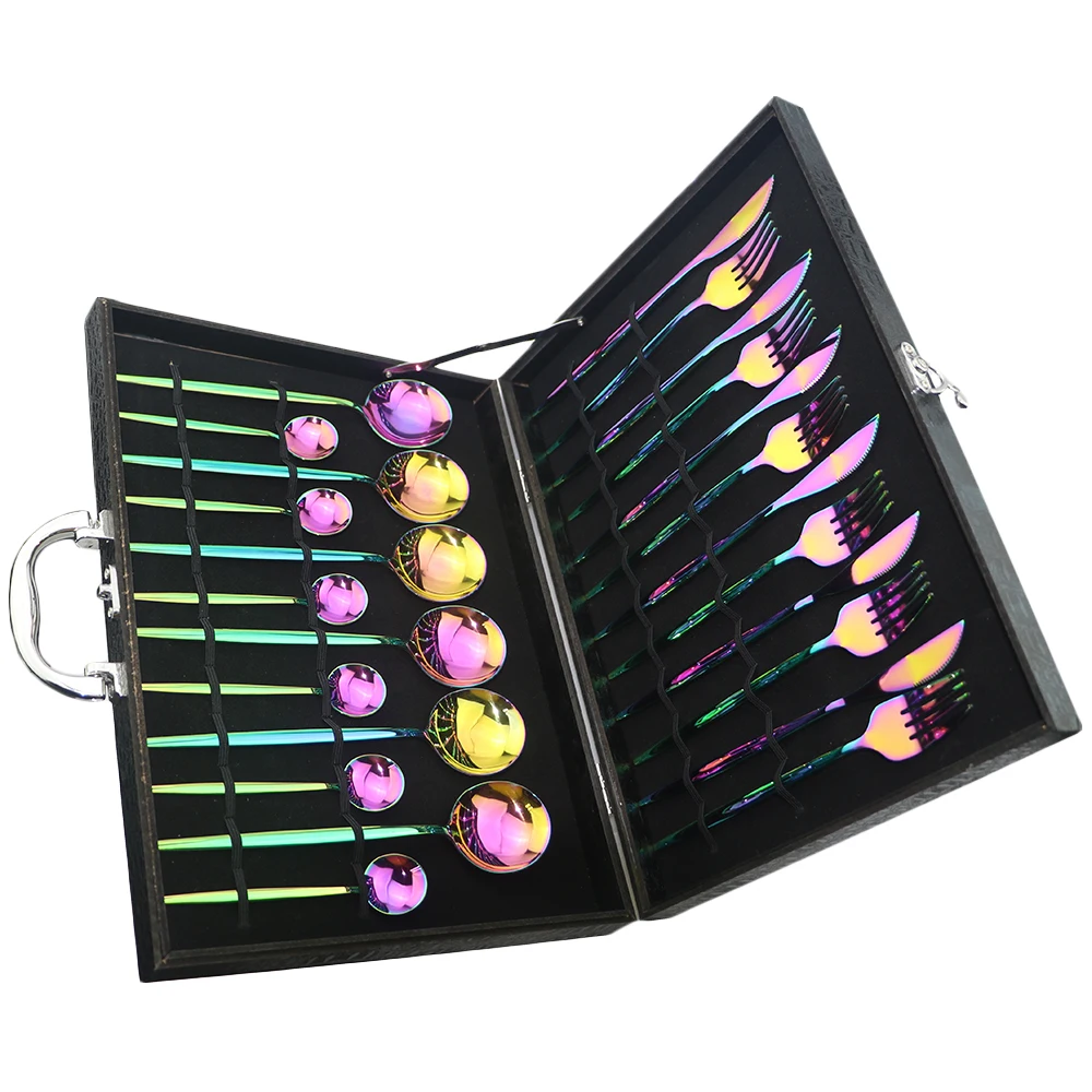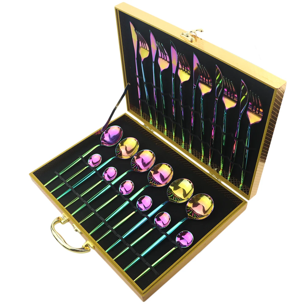 24 шт роскошный блестящий золотой Набор радужных столовых приборов 304 нержавеющая сталь набор посуды нож вилка ложка с коробкой для отеля набор посуды