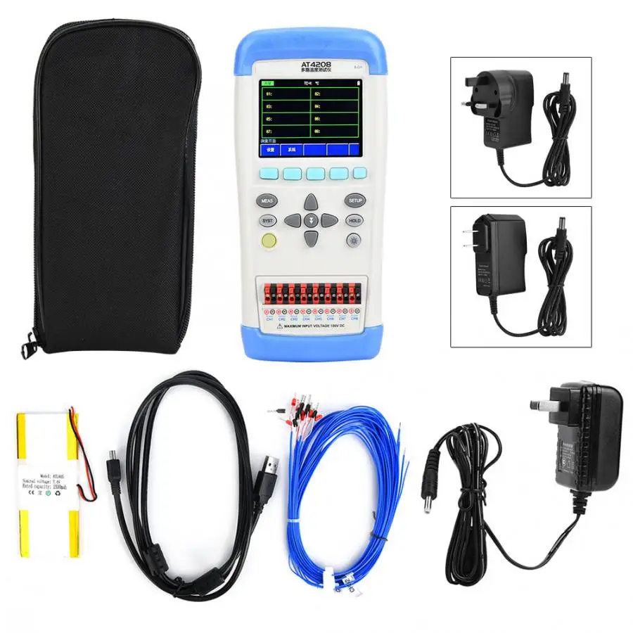 1 x Температура тестер Руководство пользователя (1 шт.) 1 х комплект термопары T (8 шт.) 1 x адаптер питания постоянного тока 1 x Батарея 1 х USB кабель связи 1 x сумка