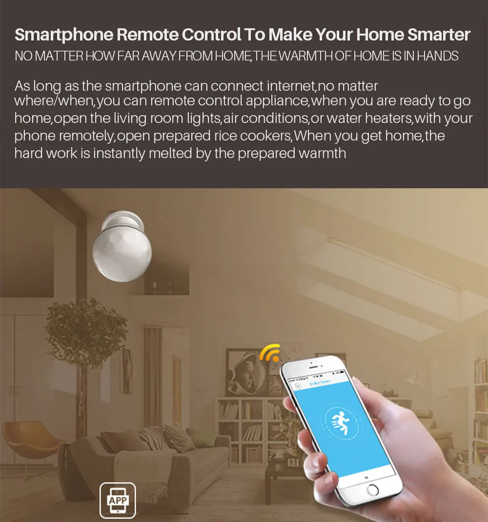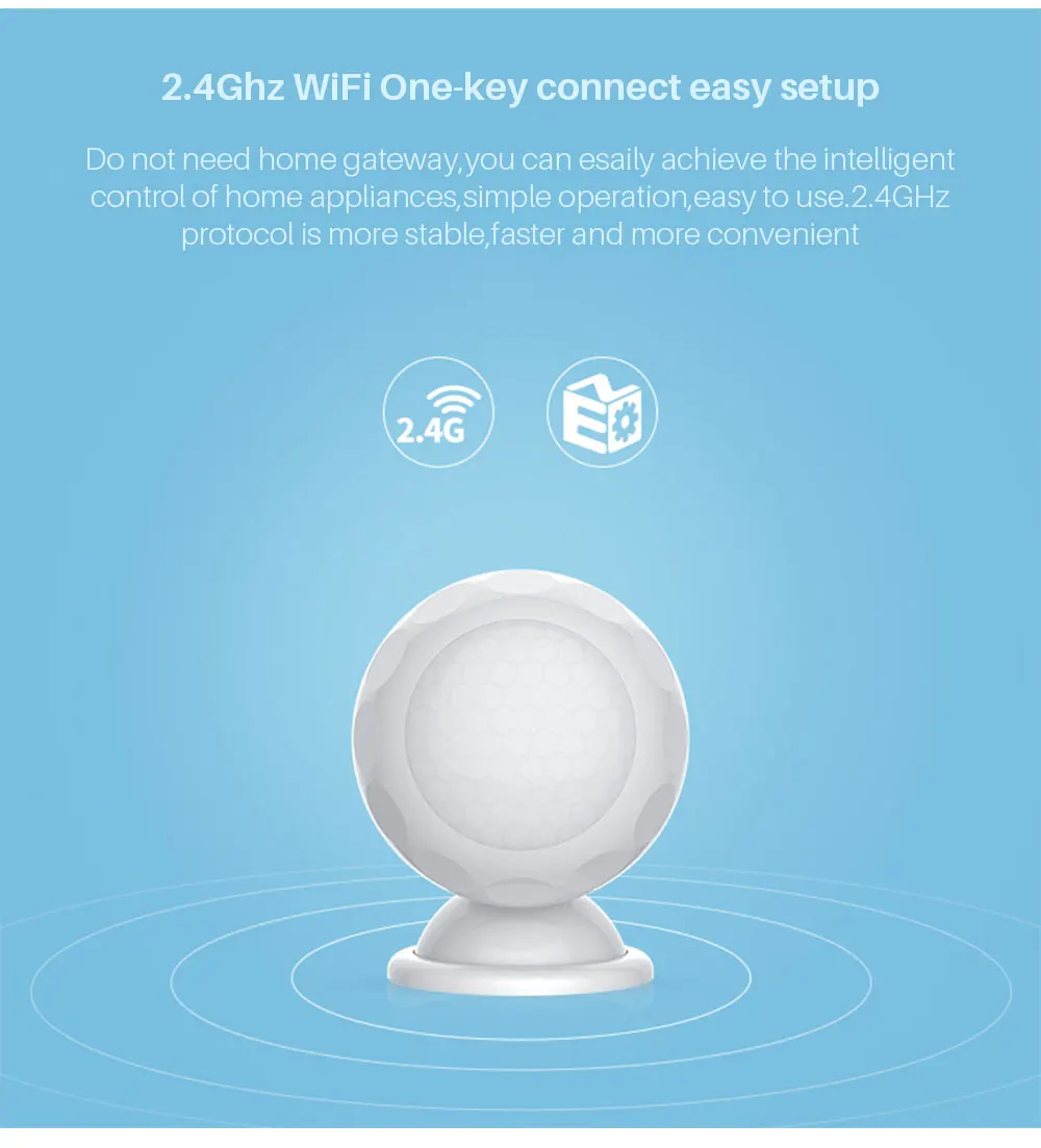Новый PIR WiFi датчик движения Измерьте чувствительность на светильник Батарея: CR123A x 1 (включая) Время работы в режиме ожидания: 2 года Расстояние чувствительности: 7 м Угол чувствительности: 110 ° Подождать: 13uA Беспроводной Тип: 2,4 ГГц Протокол: IEEE 802.11b / g / n Расстояние Wi-Fi: 45 м Рабочая температура: 0 ℃ ~ 60 ℃ (32 ° F ~ 104 ° F) Рабочая влажность: 20% ~ 85% Бесплатное Применение: Tuyasmart или intelligent life. Системы поддержки: Android и IOS. Размер продукта (Д * Ш * В): 45x45x48мм