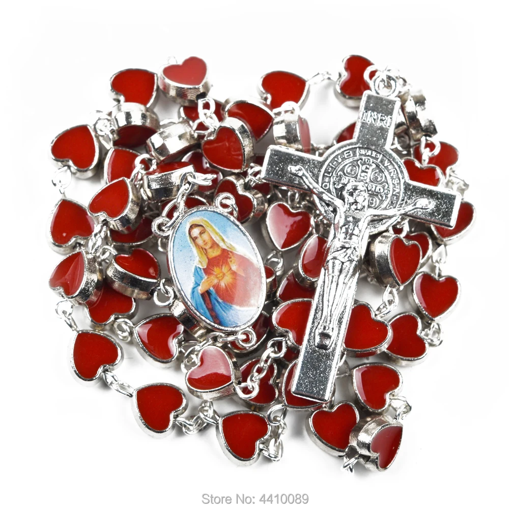 Catholic Rosary Red Heart Alloy Beads Rosary Necklace For Man Item No.: RQ343 Material: Zinc Alloy Color: Red Size: 8*9 mm Weight: 67 g Length: 55 cm Pack: 1 pieces