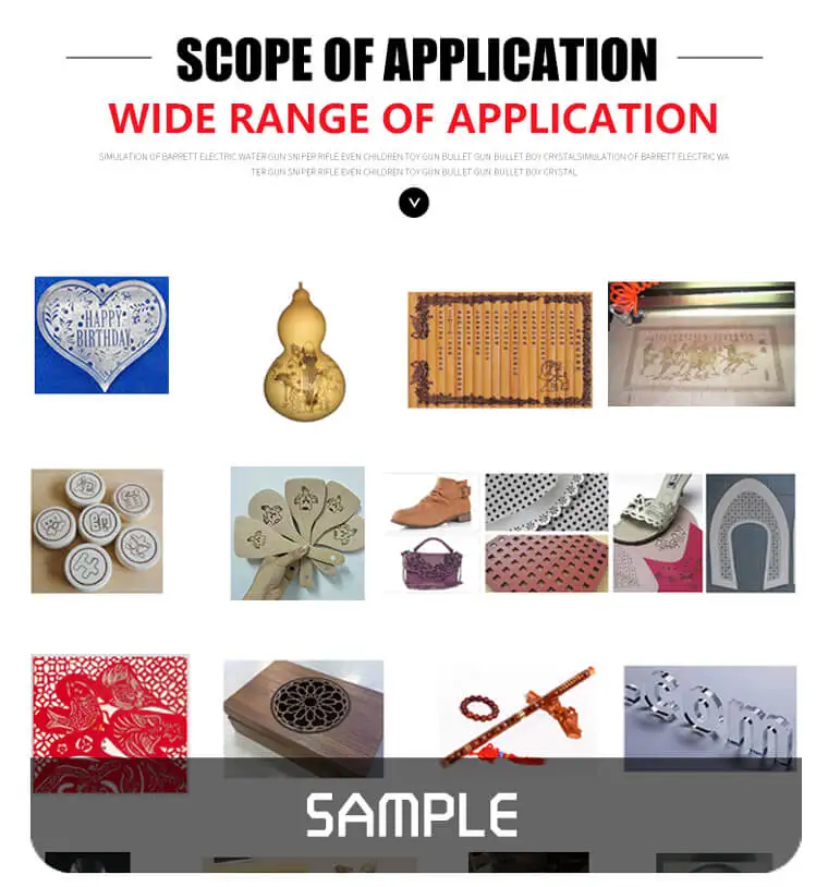 Одежда из кожи, обуви, рекламного искусства, плексигласа, ремесла, подарки, украшения, производство мебели, печать, бронзирование и другие отрасли, ценовые концессии, использование Лазерной Гравировки и режущего станка может обеспечить гравировку, пробивку, порезку, маркировку, маркировку поверхности, резка и другие обрабатывающие процессы.