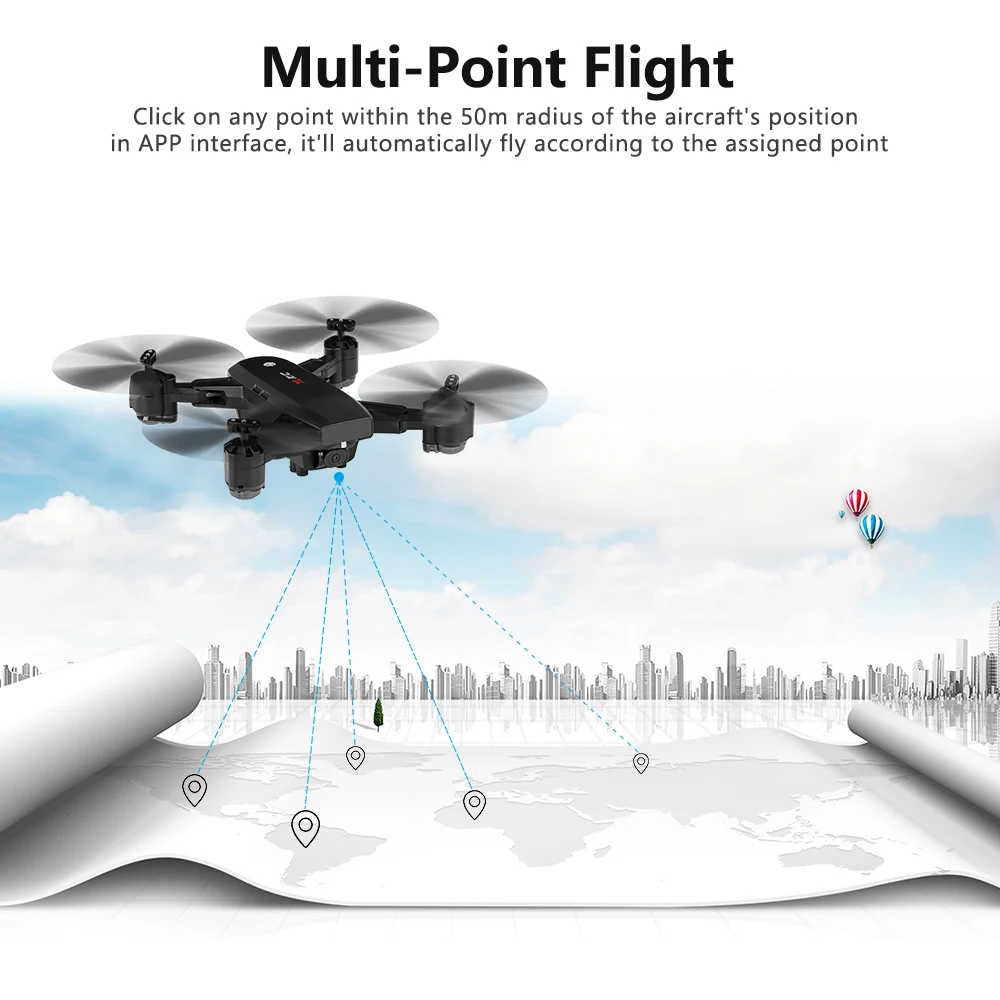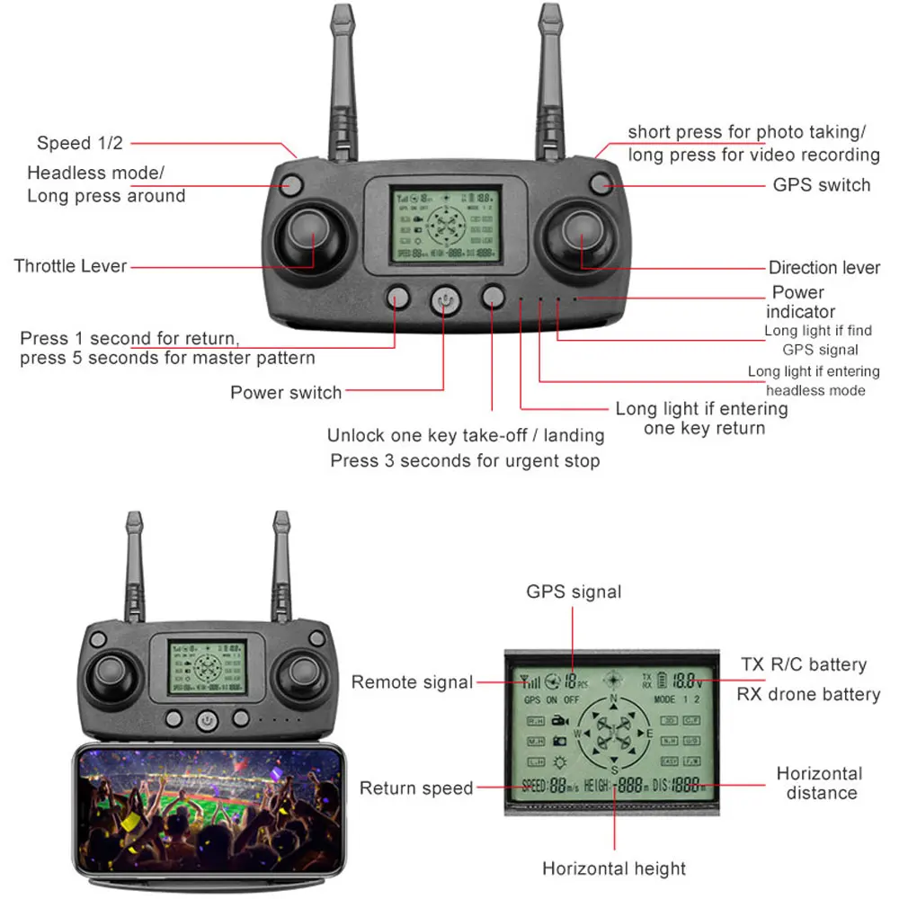 Функция: 5G WIFI FPV, широкоугольная камера, приложение управления полетом, GPS автоматическое возвращение, 500-метровое расстояние полета, режим следования за мной, режим высоты, режим полёта Waypoint, фиксированная точка вокруг, режим виртуальной реальности, Безголовый режим, фиксированное наведение, 2-уровневая регулировка скорости полета, один ключ Взлет/посадка, один ключ возврата