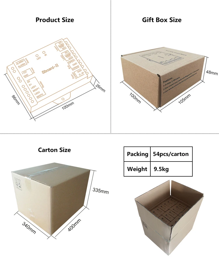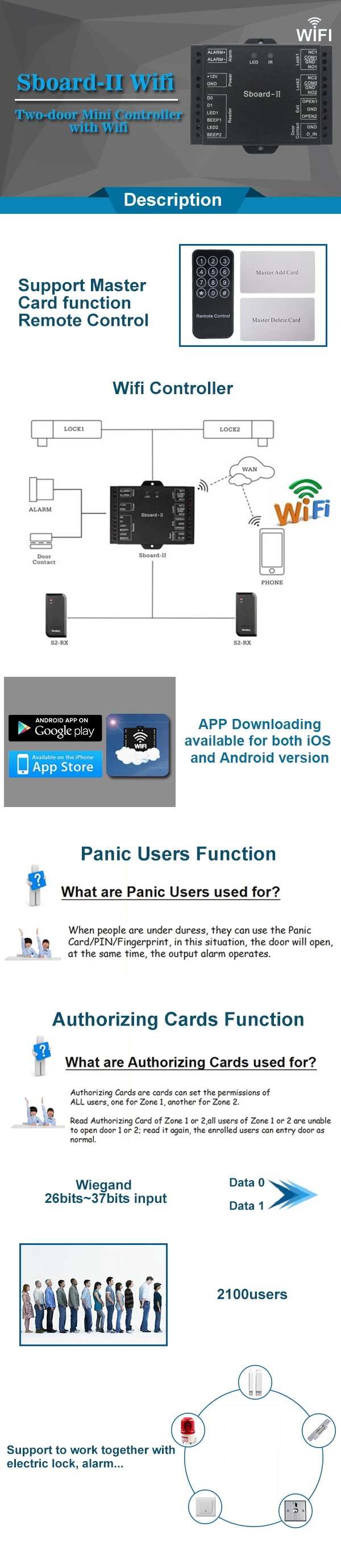 • Multi access modes: Card, Card or PIN, Card with PIN and multi Cards/PINs• Can connect with any reader with Wiegand 26~37 bits output• Can connect with any keypad reader with 4bits, 8bits (ASCII), or 10bits Virtual number output• Support Master Card function• Support set principal card• Can communnicate with mobile by Wifi/GPRS• Remotely open the door within your home network or remote from anywhere you can get internet access with your smartphone or tablet Specifications:Model No.