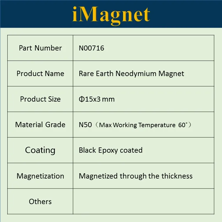 Описание продукта: Форма: дисковые тормоза Материал: магниты NdFeB (неодим-железо-бор Класс: N50 Размеры: прибл. Φ15x3mm Покрытие: черная эпоксидная смола Hcj≥ 10,5 Кэ Hcb≥ 12Koe BHmax: 47-51 MGOEe Количество: 4 шт.