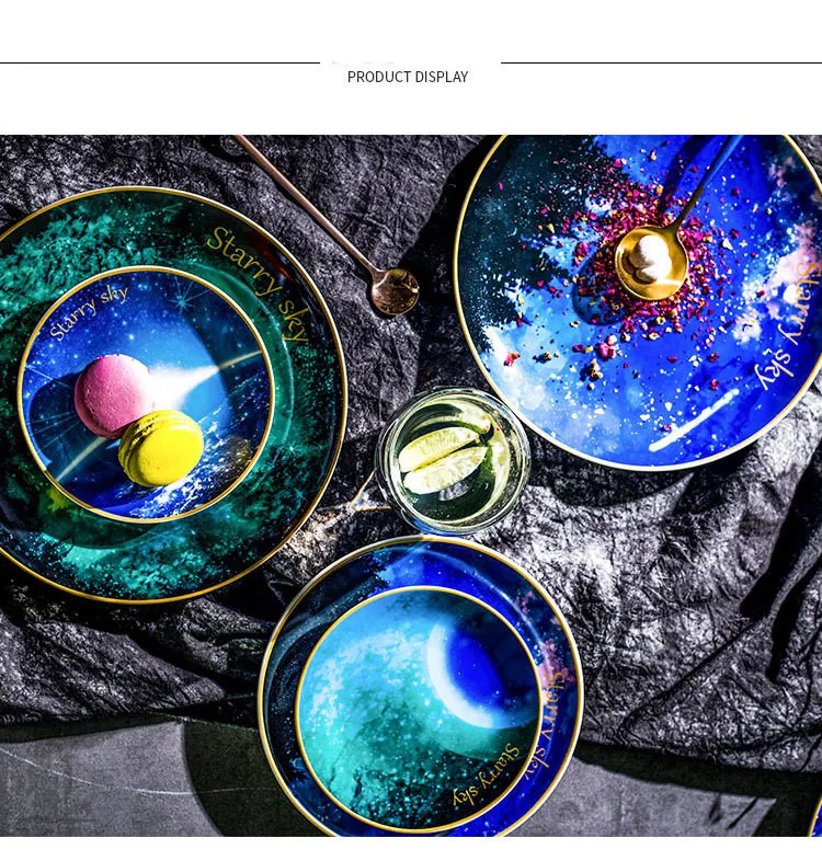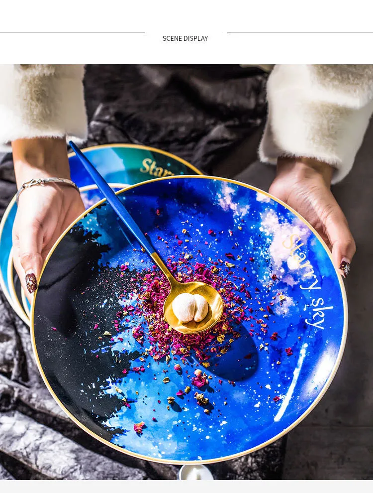 [Характеристики и упаковка] Цвет: Galaxy / Meteor / Morning / Moon dye Размер (общая посылка): -6 дюймов: Диаметр 15,5 * высота 2 см -8 дюймов: диаметр 20,5 * высота 2,3 см -10 дюймов: диаметр 25,5 * высота 2,5 см Глазурованная поверхность этого продукта гладкая и гладкая, форма формы гладкая, форма круглая, а рисунок тела-звездное небо в скандинавском стиле. Подходит для дома, офиса, ресторана или в качестве подарка. Настраиваемый логотип напечатан на нижней части пластины, и продукт может быть использован в микроволновой печи, посудомоечных машинах и т. Д.