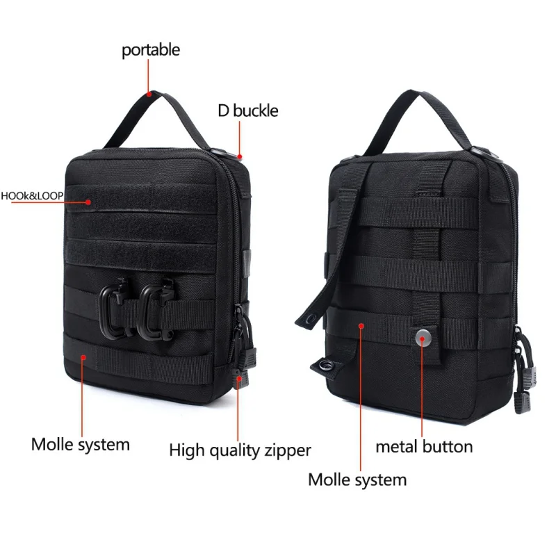 Features: 1. 1000D nylon material feels soft and delicate, the product has good air permeability, the internal multi-pocket classification is clear and orderly. 2.The bag has built-in bandage fixing place and pockets, which can put into many kinds of outdoor medical supplies in order. 3. Simple handle design can reinforce inclusion body. Small accessories can also be mounted. 4. Nylon clasp attachment on the outside could be used to attach the personality items or stick on the backpack. 5. Molle designed for attaching to other Molle systems, such as hunting vest, large bags and so on. 6. Durable buckle design, the package is more closely fitted, can be loaded on large bags or belt use. 7. Specially made for camping, hiking, fishing and other outdoor sports which would be a great gift for outdoor sports enthusiasts. Specifications: Material:1000D nylon Size:24x17x4cm Color:Black,green,mud color Theme:Sports Sport Type:Climbing,Fishing,Cycling,Camping,Hiking,Adventure,Travel Features:Portable,durable,lighatweight,wear-resistant,waterproof,tear-resistant Backpacks Type:External Frame Rain Cover:No Gender:Men,women,unsex Package included:1x First Aid Kit Pouch
