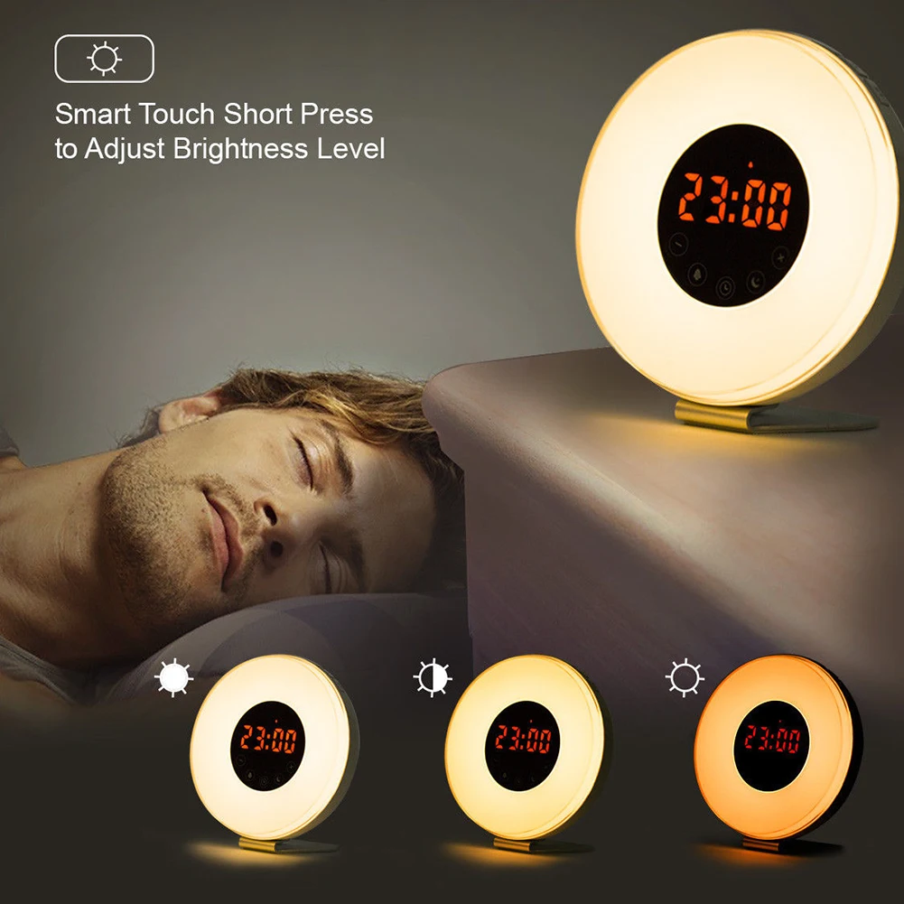 Функция моделирования и повтора солнца: 30 минут до времени будильника, теплый белый свет постепенно осветляет от 0% до 100%, чтобы мягко разбудить вас естественным и удобным. Нажмите кнопку повтора, когда сигнал тревоги, чтобы получить дополнительную 5 минут сна