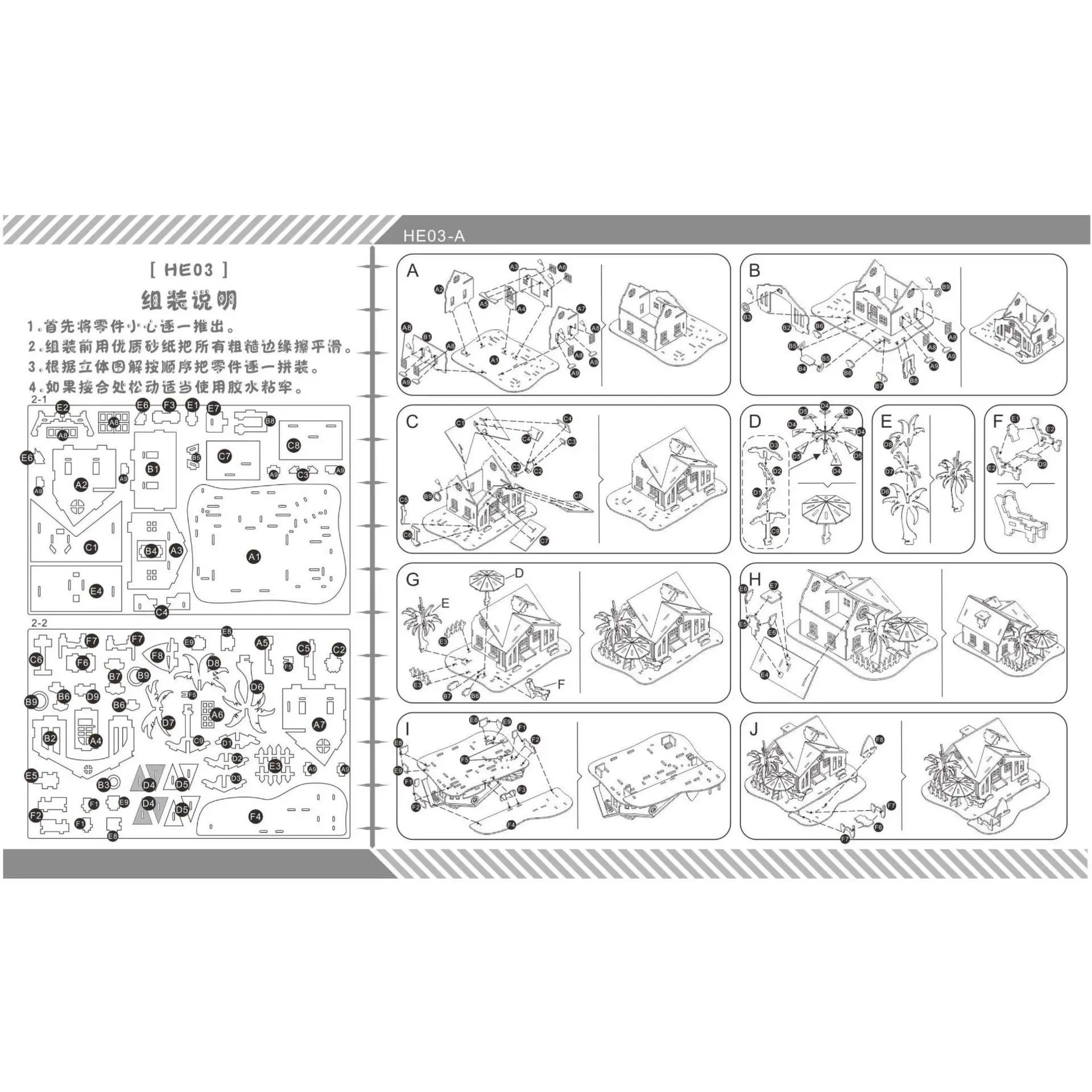 所有激光切割模型产品配有3D立体拼装步骤说明书,拼装逻辑清晰,部件卡口精准完美互配,易于组装.