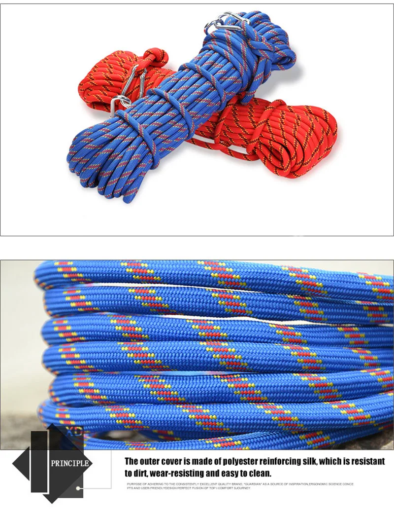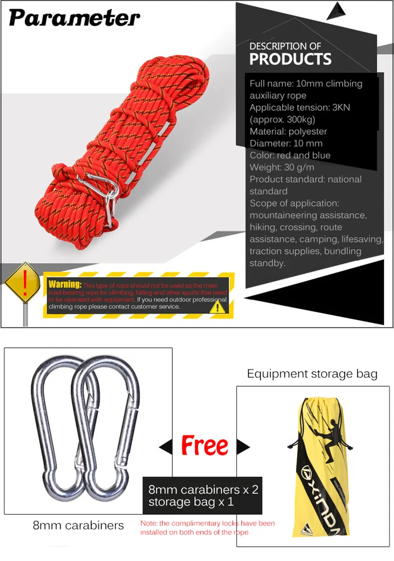 Описание продукта: Полное название: Вспомогательная веревка для скалолазания 10 мм Применимое напряжение: 3 кН (прибл. 300 кг) Материал: полиэстер Диаметр: 10 мм Цвет: красный и синий • Вес: 30 г/м Стандарт продукта: национальный стандарт Сфера применения: помощь в альпинизме, походы, пересечение, помощь в маршруте, кемпинг, спасательные, тяговые принадлежности, комплект в режиме ожидания Есть другие длины (10 м, 15 м, 20 м, 30 м, 40 м, 50 м, 100 м) на выбор, пожалуйста, перейдите в магазин для других ссылке