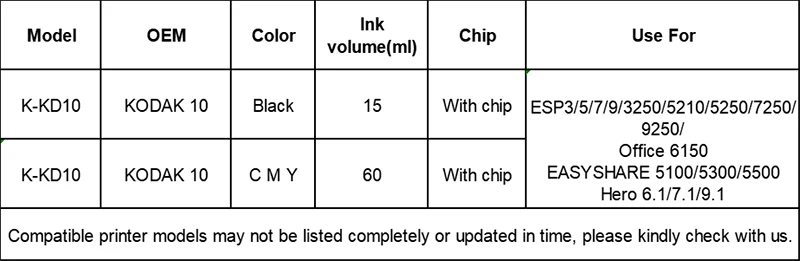 Кд10 совместимый чернильный картридж посылка включает в себя: 1 шт. KD10 (1BK) 1 шт. KD10 1(C Y M)