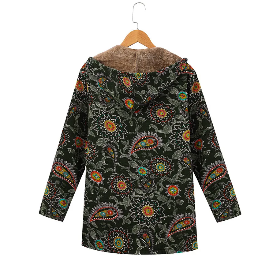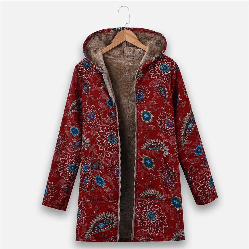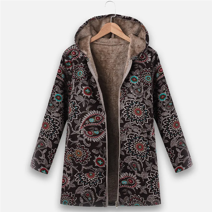 Женское винтажное пальто с геометрическим принтом, зимнее теплое пальто большого размера плюс с капюшоном и карманами в стиле ретроИнформация о продукте