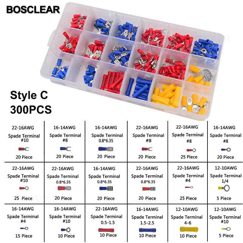 Спецификация: 175/180/300/360 шт Различные изолированные кабельные наконечники для электрических проводов терминалов обжимной соединитель Лопата комплект Количество: 18/типов Материал: медь + ПВХ + жести Размер упаковки: 178 мм x 100 мм x 25 мм Описание: Изолированные обжимные клеммы Различные обжимные клеммы и чехол Все они заключены в пластиковый чехол для легкого доступа Обеспечивает визуальный осмотр, предотвращает коррозию и обеспечивает водонепроницаемое уплотнение