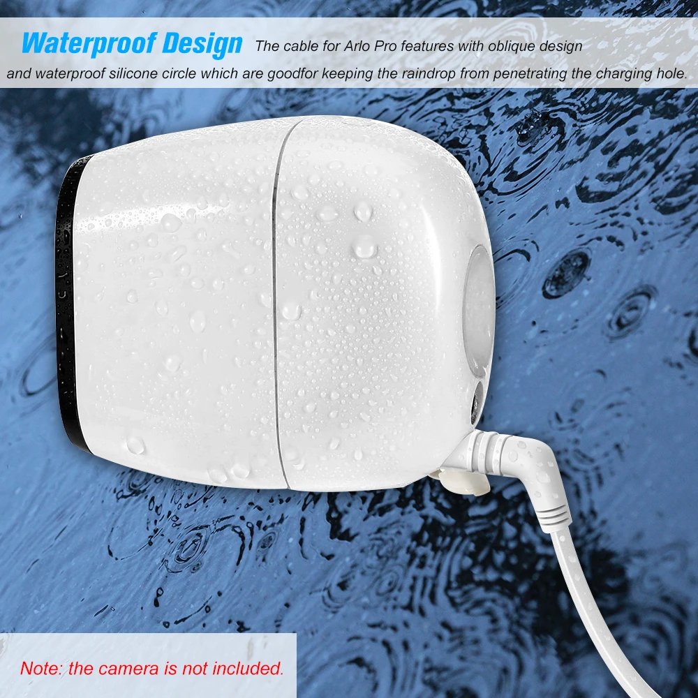 * Водонепроницаемый Дизайн: кабель для Arlo Pro оснащен вертикальным дизайном и водонепроницаемым силиконовым кольцом, который хорошо защищает каплю дождя от проникновения в отверстие для зарядки.