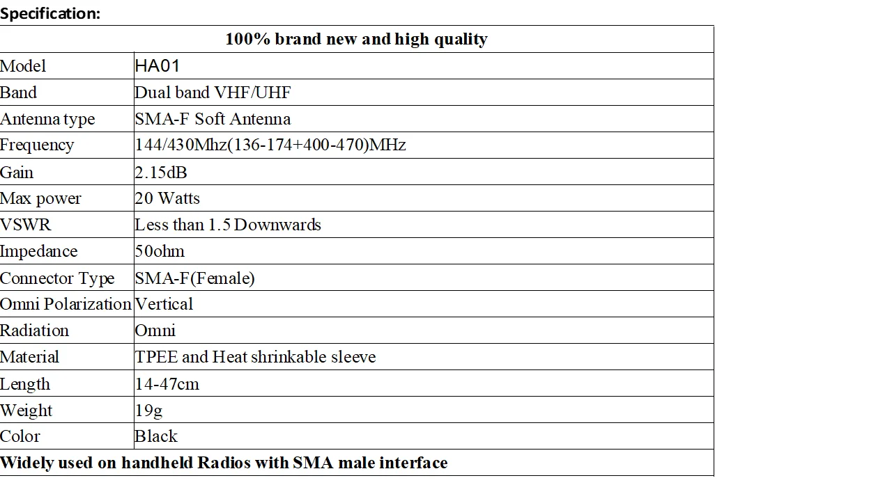 The Original Retevis HA01 Elite Antenna will allow you to get longer range on your handheld radio, like Retevis RT-5R,H-777,RT5,BaoFeng 888s,UV-5R radio. This antenna features a 2.15dBi with up to 20 Watts of power. It is 14-47cm in length and weighs 19.7g Package Includes: 1 x High-Gain SMA-F Antenna