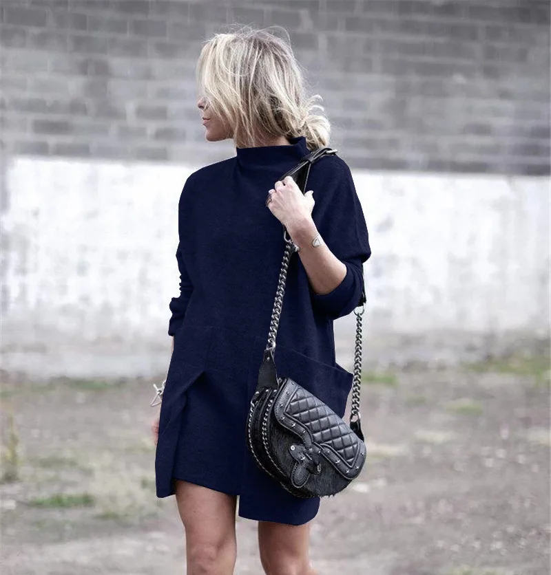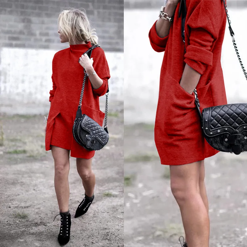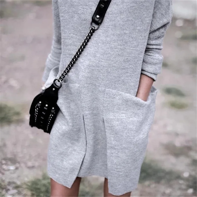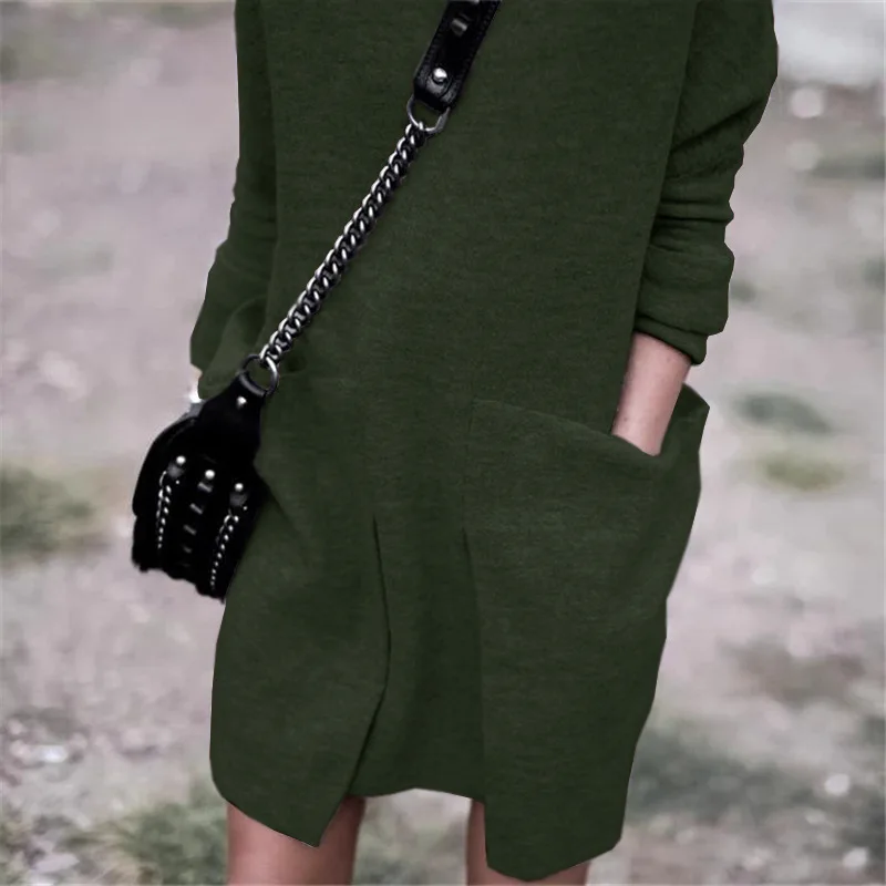Осенне-зимнее женское платье с длинным рукавом, однотонное платье с круглым воротником и большим карманом, элегантное уличное платье vestido Vestidos