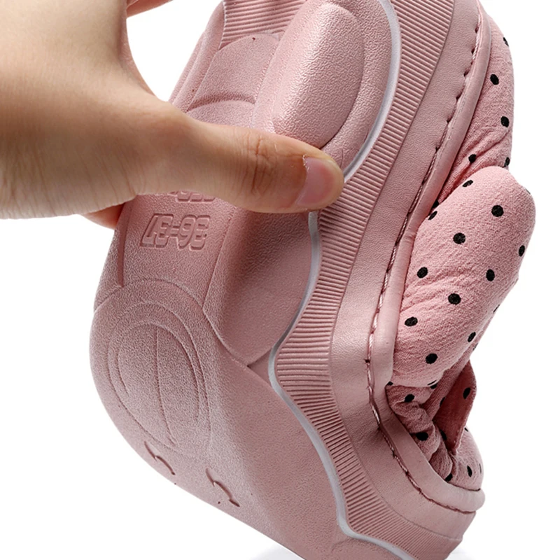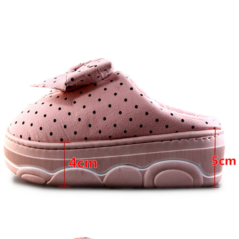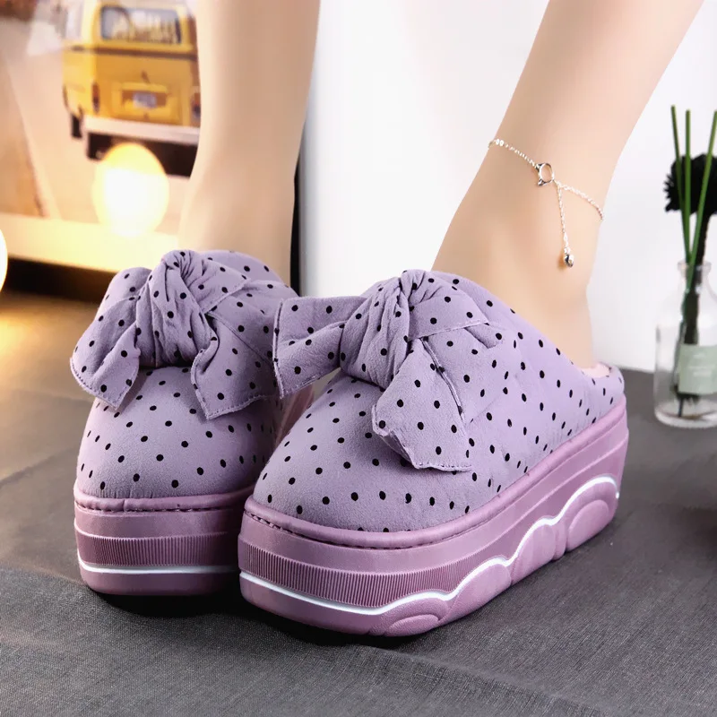 Модные женские хлопковые тапочки; милые зимние домашние утепленные тапочки в горошек на высоком каблуке с бантом; женские нескользящие плюшевые Тапочки