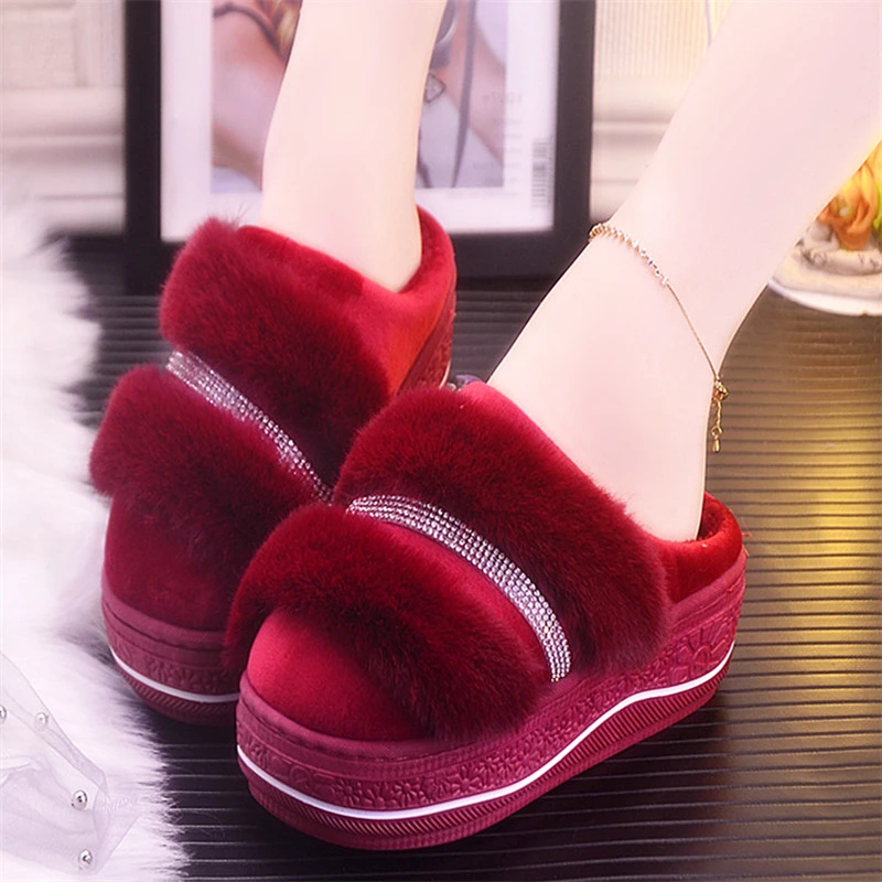 Новые зимние теплые хлопковые тапочки на Высоком толстом каблуке; Женские тапочки; Стильные водонепроницаемые домашние теплые меховые Тапочки