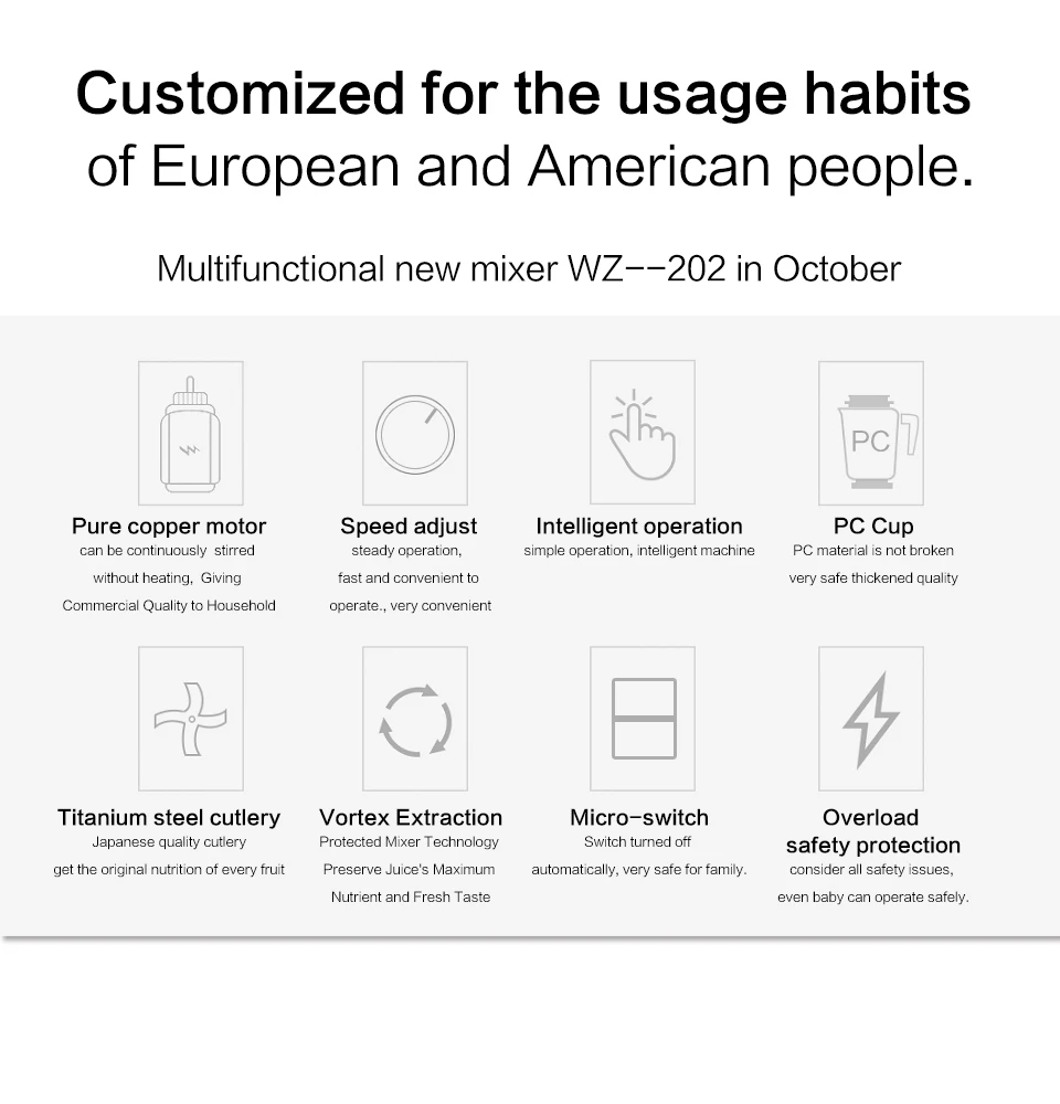 Подгоняется под привычки использования европейских и американских людей. 1. Двигатель из чистой меди 2, Скорость регулировки 3 、 интеллигентая (ый) операции 4 、 ПК чашки 5. Столовые приборы из титановой стали 6 、 вихревой экстракции 7. Микропереключатель 8. Защита от перегрузки