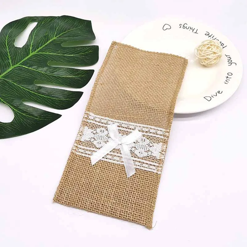5Pcs Jute Linen Lace Cutlery Bag Prefer Country Decoration Retro Wedding Decoration Party Birthday Tableware Supplies Holder Bag