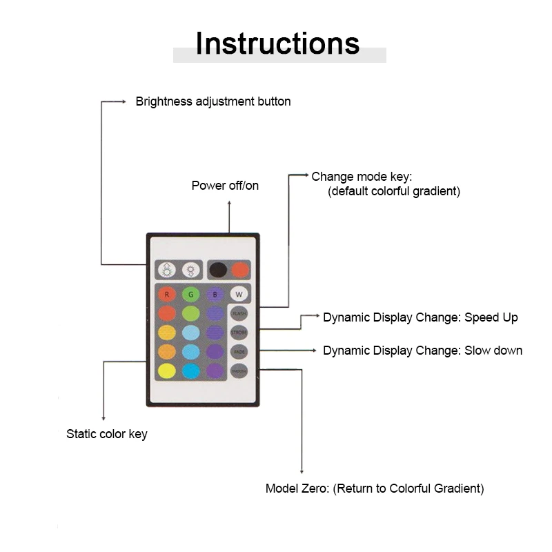 2. Яркость монохромного цвета регулируется. Три цвета, соответствующие фиксированному цвету, могут быть выбраны через пульт дистанционного управления. По умолчанию средняя яркость.
