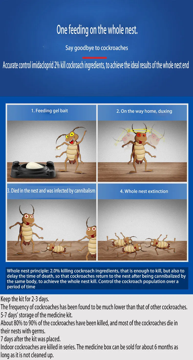 Около 80%-90% тараканов были убиты, большинство тараканов будут инфицированы в гнезде, в основном не видно тараканов в возникновении.
