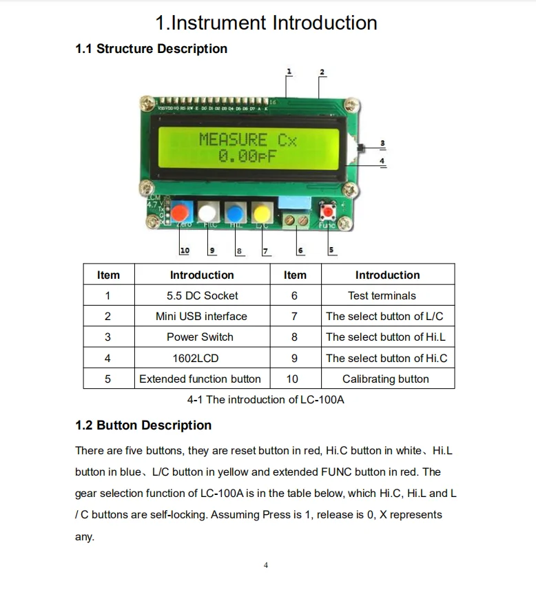 Feature:ICSH014A is a “Capacitance, Inductance Measuring” module.Engaged in the development of electronic engineers often need to measure inductance and capacitance, and inductance capacitance meter sold on the market price is higher, and the measurement of small capacitance inductance and small error, this instrument based on LC resonant principle, join the accurate measurement of high-speed micro controller calculation, small capacitance can be measured the inductance 1uH and less than 1pF, the maximum this is also the characteristics of the instrument, particularly suitable for microwave production and switching power supply transformer, inductance measurement.Four measured mode for ICSH014A (LC module) :1.C mode...... Capacitance (0.01pF-10uF).2.L mode...... Inductance (0.001uH-100mH).3.HL mode...... Large inductance (0.001mH-100H)4.HC mode...... Large capacitance (1uF-100mF)All stalls are automatic range, the use is very convenient. In this way, ICSH014A Whether from the measurement range and measurement precision can completely replace any kind of inductance and capacitance measuring instrument on the market, the performance parameters to the digital bridge, is a highly cost-effective instrument.Technology Parameters:Structure Introduction:The overall effect diagram . When in use, you can use the Micro USB connection line is connected to the computer USB testing instrument power supply, if the user has a mobile phone charger with USB or with 5V power adapter with DC plug can also be directly to the instrument power supply. Special note: if you are using DC plug adapter, polar please hole positive confirmation, peripheral negative, while the Micro USB interface does not occur polarity error conditions.Instrument structure:The button has a total of 5, "Reset" to 0 "HC" button, large capacitance, inductance, select "HL" option, "L/C" and black expansion function button. The HC, HL and L/C selection is self lock , a press release was 1, 0, and X represents the arbitrary function, see the table below:ICSH014A Fuction tableUsage:1. Connecting computer USB as the tester and switch on the power supply