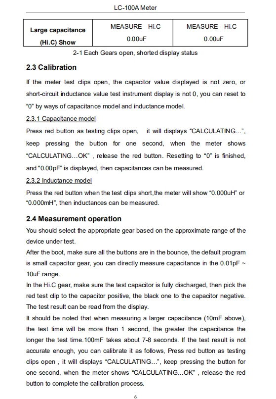 4. In the HC file, please make sure the capacitor is fully discharge to be measured, and then the red test clamp capacitor cathode, black test clamp capacitor anode, read the test results from the display screen and can, need to pay attention to is, the measurement of large capacity (more than 10mF), the test time can be more than 1 seconds, the test time of capacitor the longer the 100mF, about 7-8 seconds before the results. Matters Attention: 1. HC mode measuring electrolytic capacitor, please note the polarity is negative, red black. 2. If the measurements before the display is 0, sometimes also need to zero adjustment, this might be the deviation is negative, but the display will not show negative. 3. Is strictly prohibited in the test terminal element when pressed zeroing button, this operation will lead to the erroneous results. 4. Is strictly prohibited without testing capacitor discharge, otherwise there may result in damage to the meter. 5. To use the 5V adapter module power supply, ensure that the polarity is negative "", otherwise it will damage the module.