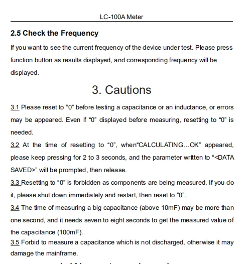 3. Because of the measurement principle of the HC file is different, first stated the following Lx, Cx and HL three mode of operation: In the three mode , the measurements are required for zero adjustment. The methods according to different inductance, capacitance . Cx mode in terminal open state, press "Reset" key, the screen shows "Setting... OK "after the release, the screen time line should display" 0.00pF "; HL and Lx mode, the terminal short-circuit condition, press" Reset "key, the screen shows" Setting... OK "after the release, the screen time should show" 0.000mH "and" 0.000uH ", after the open circuit terminal for display" Over Range!". Then, you can put the inductance connected test instrument to test. In the measuring result displayed, press the function keys are black, will display the test frequency current.