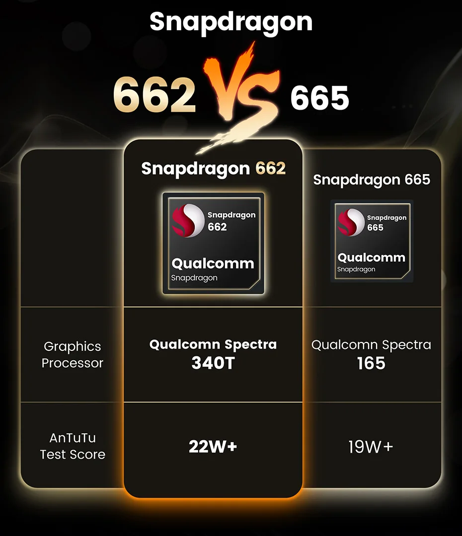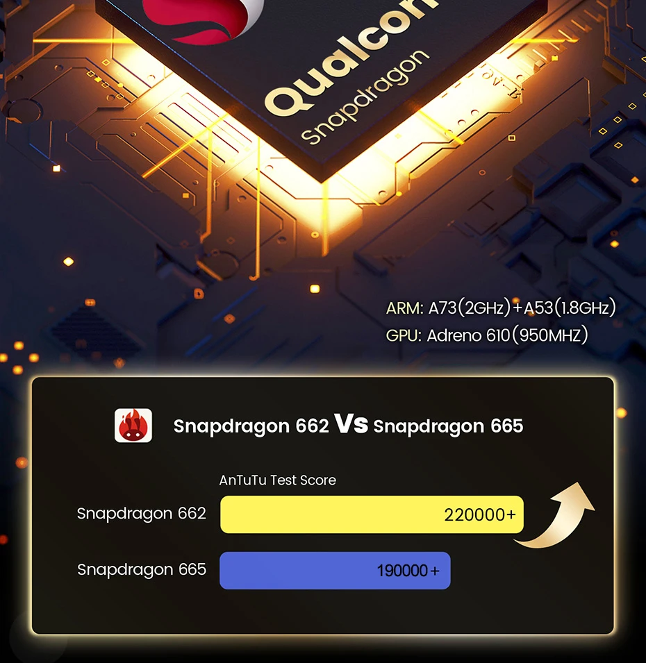Устройство, док-станция Qualcomm Snapdragon 662 Процессор муфта для рук: A73 (2 ГГц) + A53 (1,8 ГГц), графического процессора: Adreno610 (950 МГц)