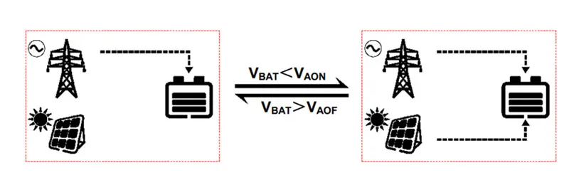 Аккумулятор заряжается в режиме приоритета солнечной батареи и когда напряжение батареи ниже, чем «Вспомогательное