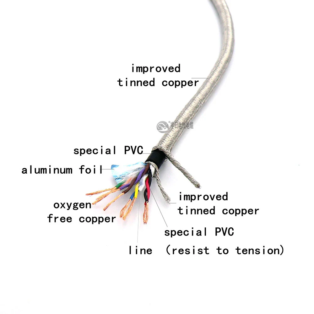 Внутреннее экранирование: алюминиевая фольга + Улучшенная луженая медная проволочная сетка с соотношением покрытия 80% и многого другого. Внешнее экранирование: Улучшенный экран из луженой меди с соотношением покрытия 90% и более.