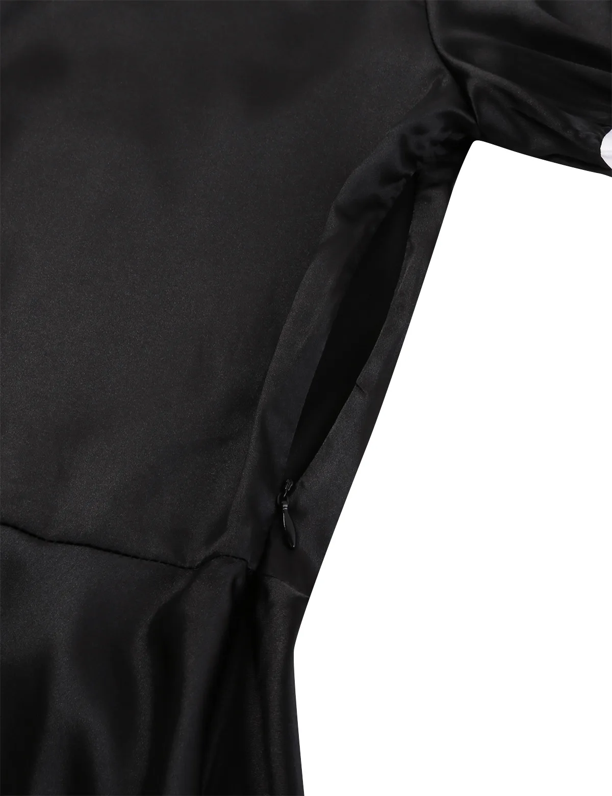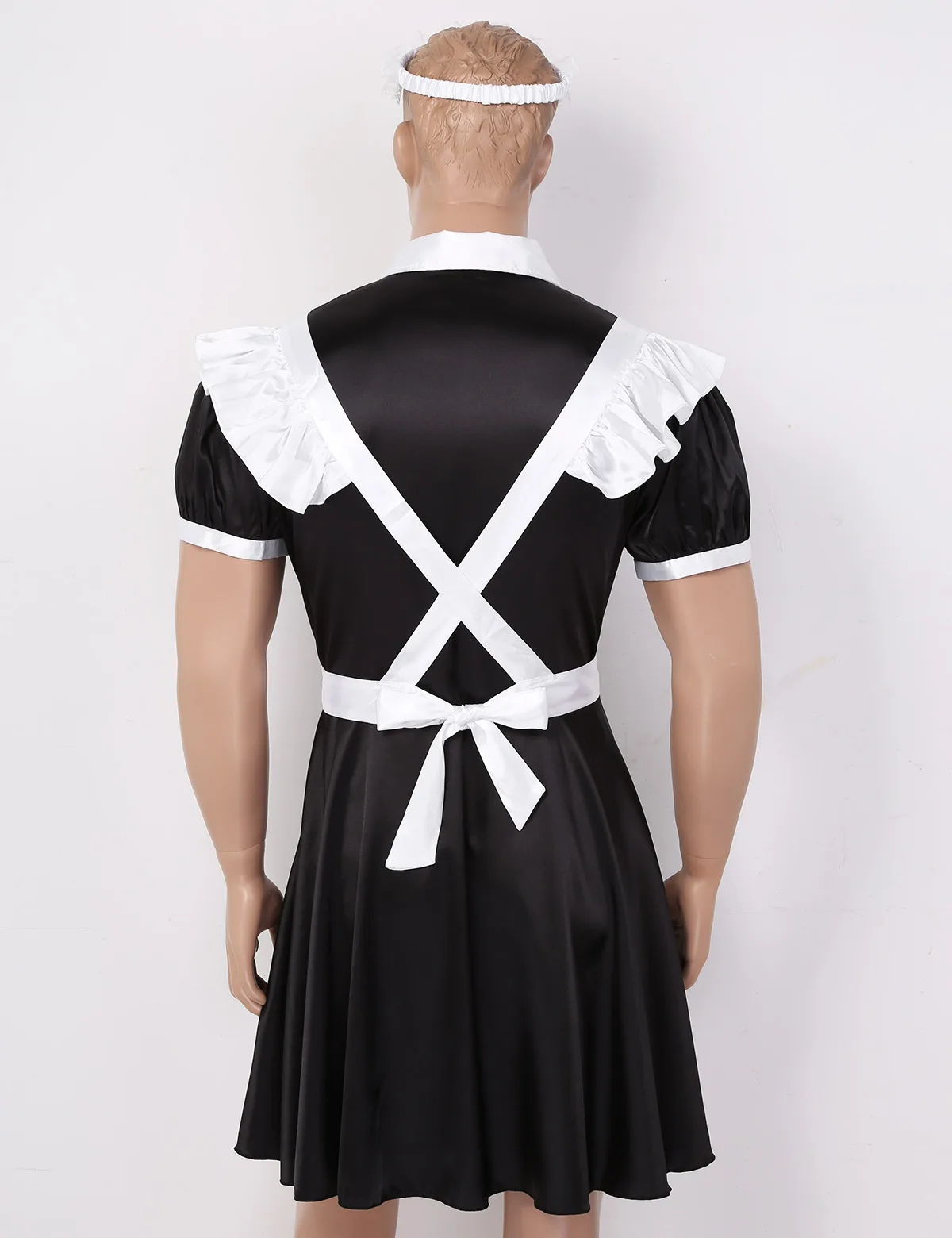 Отложной воротник и короткие рукава-фонарики, дизайнерское платье на пуговицах спереди, поставляется с отдельным фартуком и повязкой на голову.