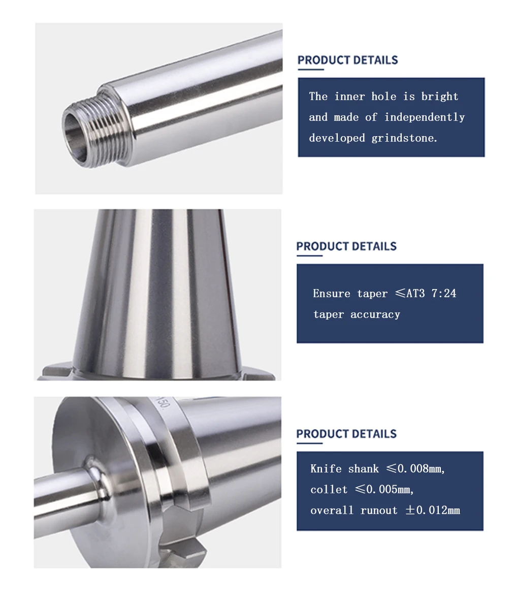 Название продукта: хвостовик серии BT50 ER Фирменное наименование: GED Общее зажимное движение: 0,01 мм ~ 0,02 мм Технические характеристики: различные Окргулости: 0,8 u Точность онтологии: 0,008 мм Глубина карбюрирования:> 0,8 мм Материал: высококачественная сталь 40CrMnTi Шероховатость поверхности:> 0,8 мм Твердость: > hrc56 ° Стандартная скорость: ниже 10000 об/мин