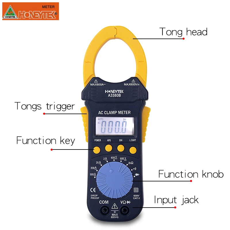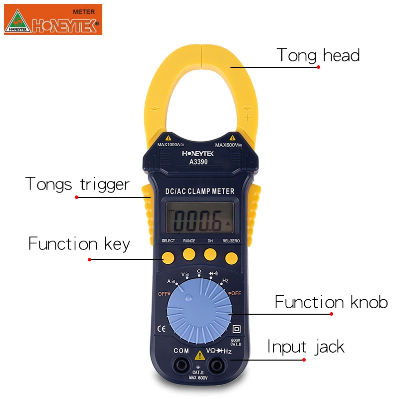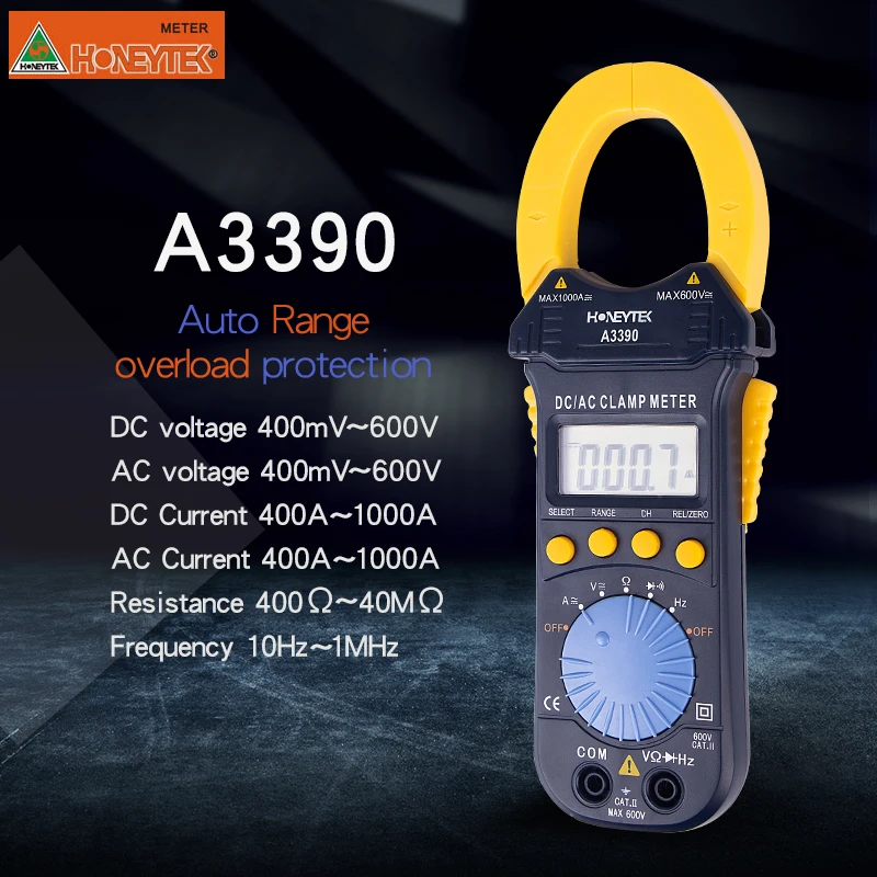 MT87 A3399 A3390 A3380B Макс Дисплей 1999 1999 4000 1999 Напряжение постоянного тока (В) 600V 200 мВ-600V 400 мВ-600V 600V Напряжение переменного тока (В) 600V 2 в-600 в 400 мВ-600V 600V Постоянный ток (A) 400A/1000A Переменный ток (A) 20A-400A 2A-200A 400A/1000A 2A-500A Сопротивление (Ом) 200KΩ 200-20MΩ 400-40MΩ 2KΩ Удерживайте √ √ √ √ Измерение диода √ √ √ √ Температура (℃) Конденсатор с алюминиевой крышкой Частота (Гц) 10-1 МГц Рабочий цикл Авто Мощность Off √ √ √ ЖК-дисплей Подсветка √ Относительного измерения значения √ Батарея 3 в (AAA * 2) 1,5 V AAA * 3 3 в (CR2032 * 3) 3 в (CR2032 * 3)