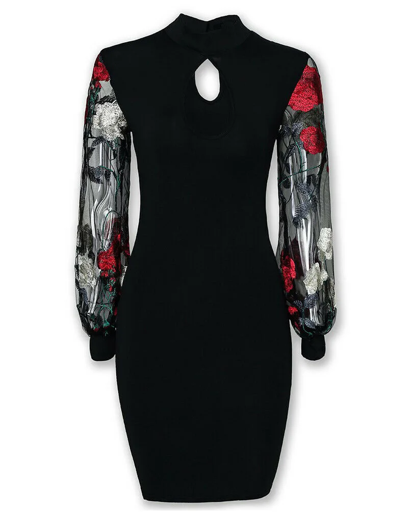 Стиль: сексуальное Сетчатое облегающее Повседневное платье с длинными рукавами и цветочным рисунком