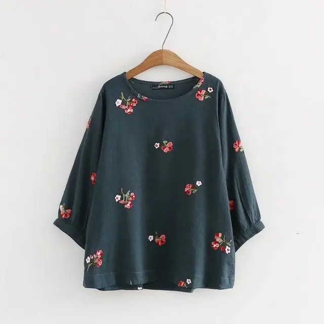Plus size Cotton linen embroidery loose women's t -shirts spring tea Three quart lanterns sleeve ladies casual o -neck t -shirts