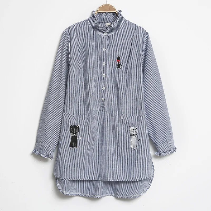 Plus Size Vrouw Tops Shirt Fashion Stand Hals Lange Mouwen Streep Kat Borduurwerk Casual Blouse Dames Blouses