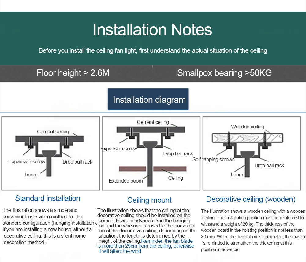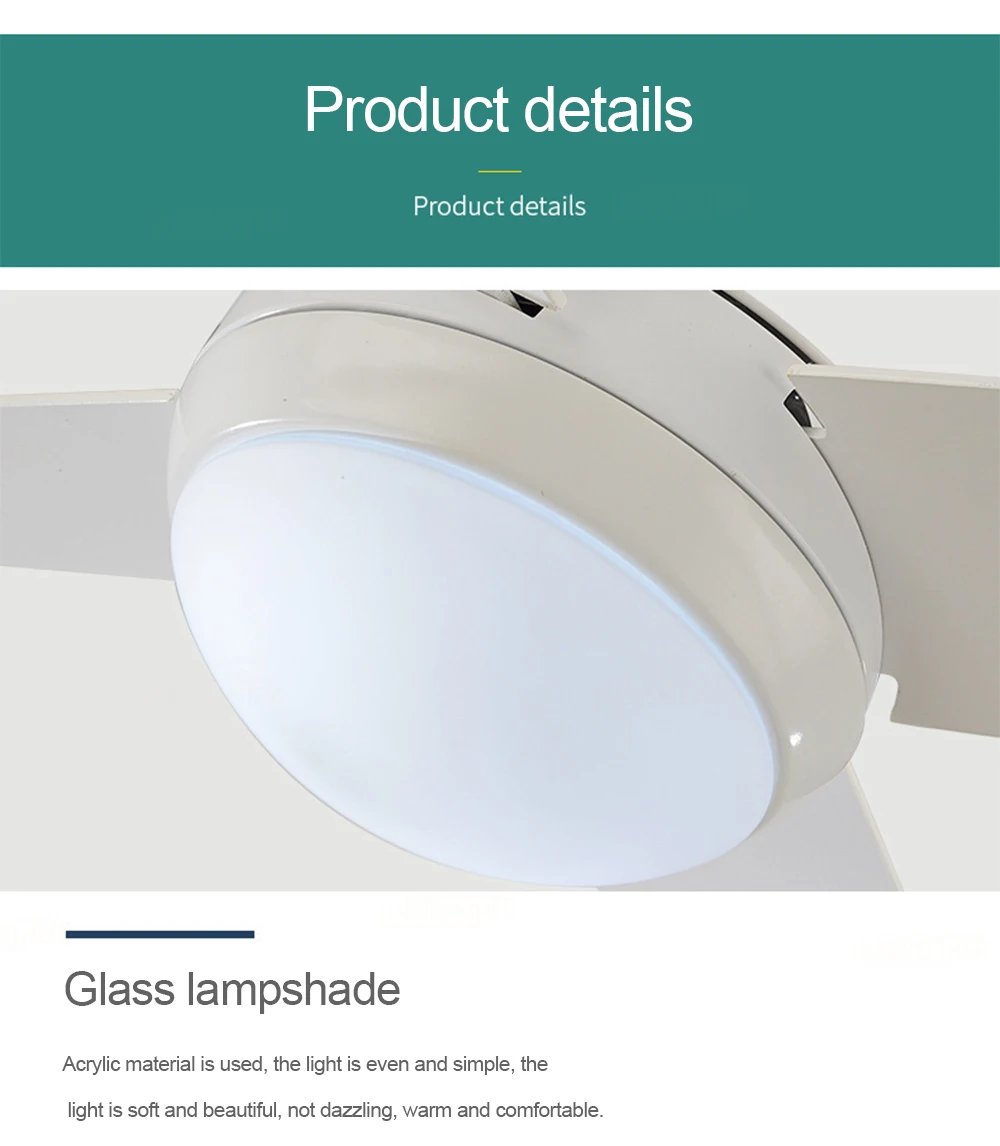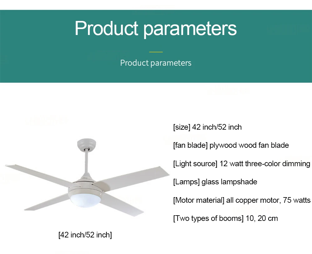 Product parameters [size] 42 inch / 52 inch [fan blade] plywood wood fan blade Fan blade expansion 106CM [Light source] 12 watt tricolor dimming [lamps] glass lampshade Lamp width 48CM [Motor material] all copper motor, 75 watts [Two types of booms] 10, 20 cm