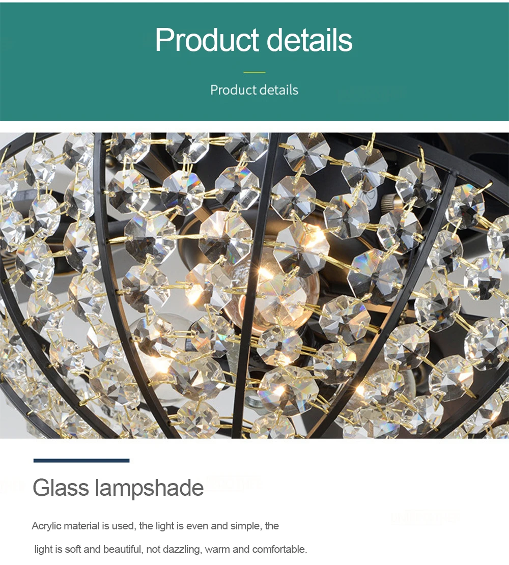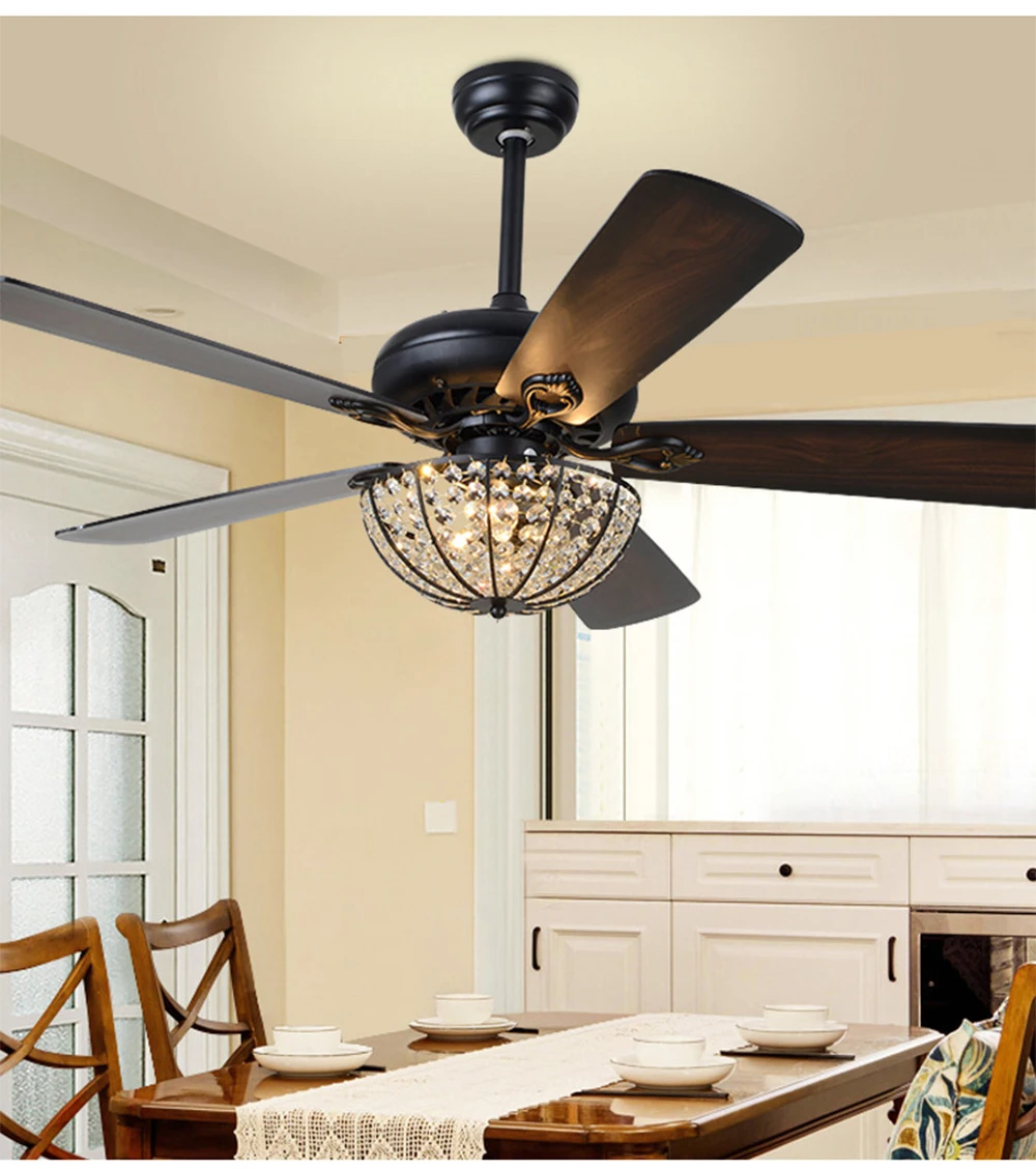 Размер: 52 дюйма лопасть вентилятора: 5 листьев дерева напряжение: 110 В, 220 В материал мотора: полностью медный мотор 52 Вт управление: трехскоростной пульт дистанционного управления переключатель, особенность: положительные и отрицательные функции два типа бумов: 10, 20 см лампы: железная рама + кристалл (без лампы)