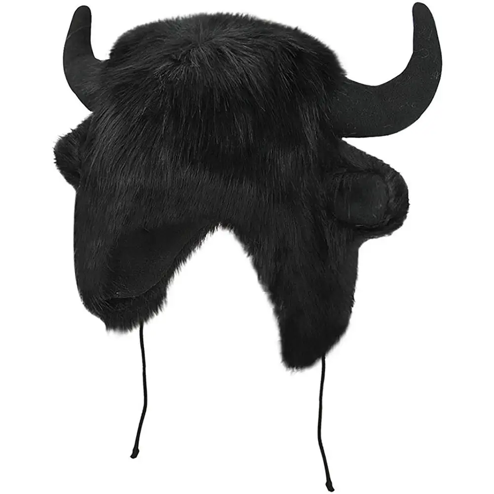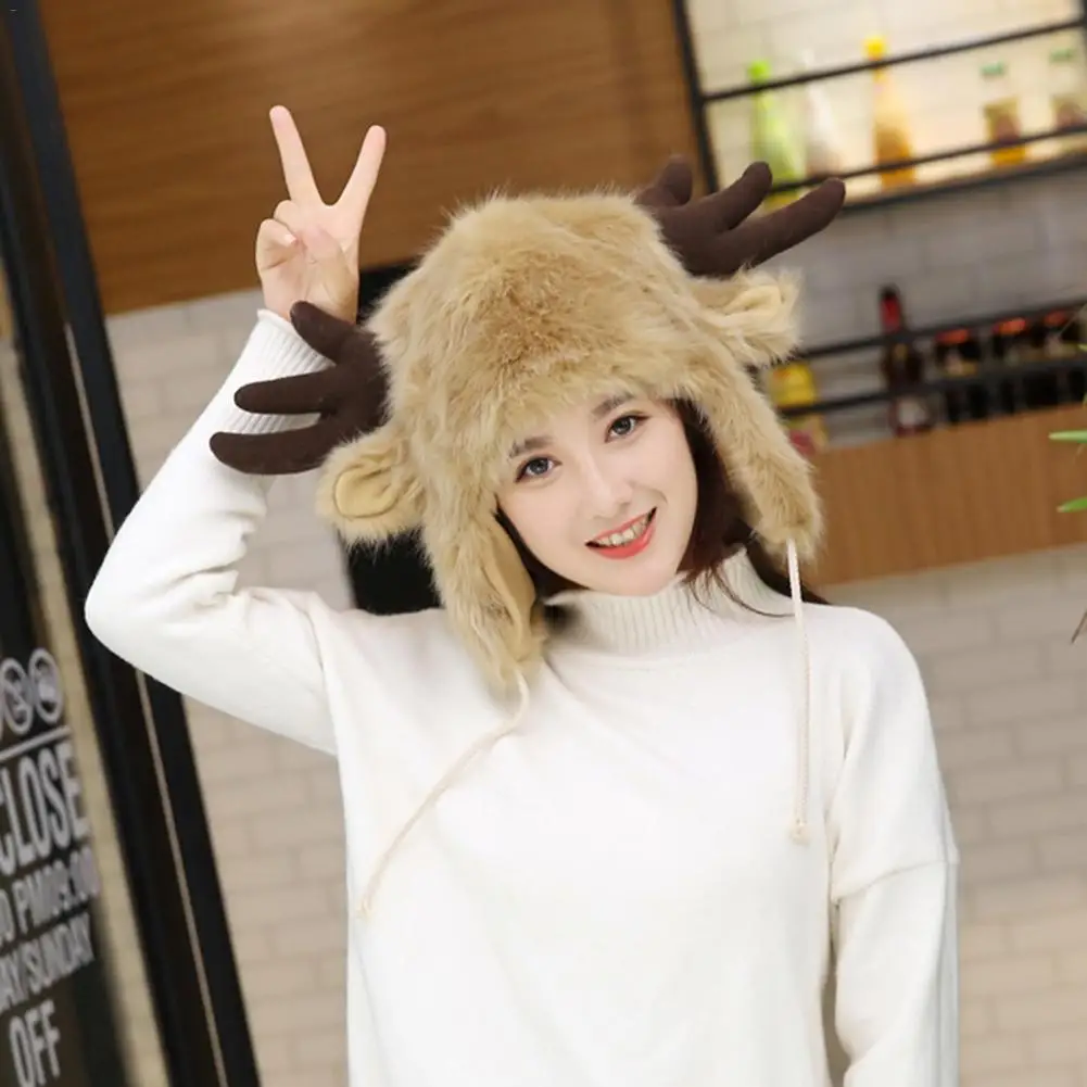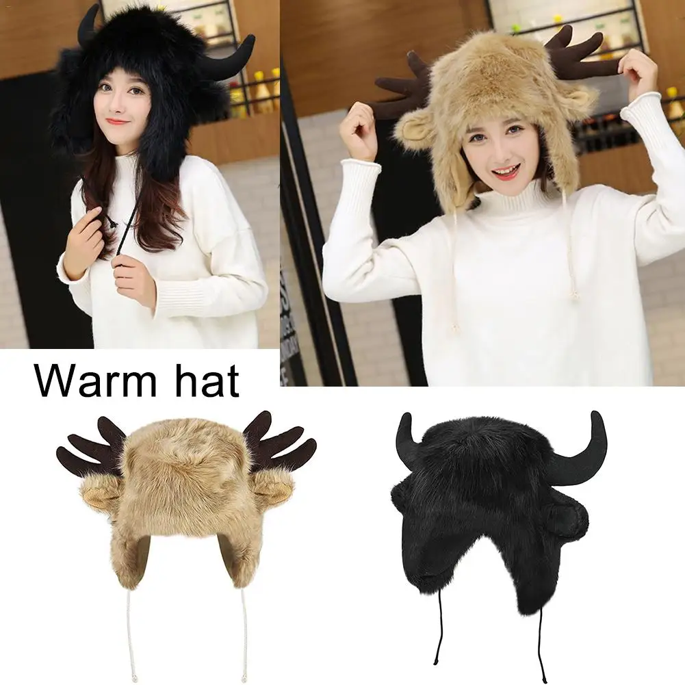 Мужские и женские рога шапки милый искусственный мех зимне наушники шапка рога шапки горячие пушистые меховые Лыжные шапки унисекс меховая голова оленя шапка меховая шапка