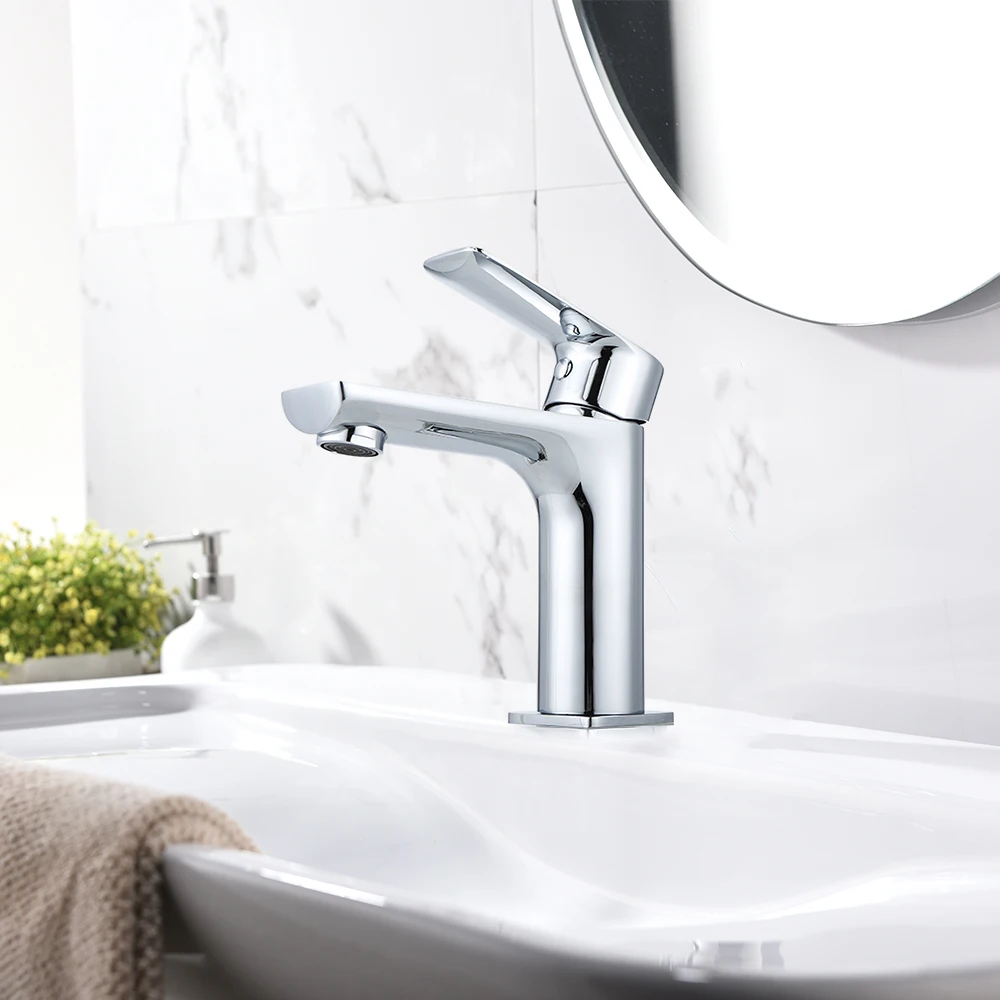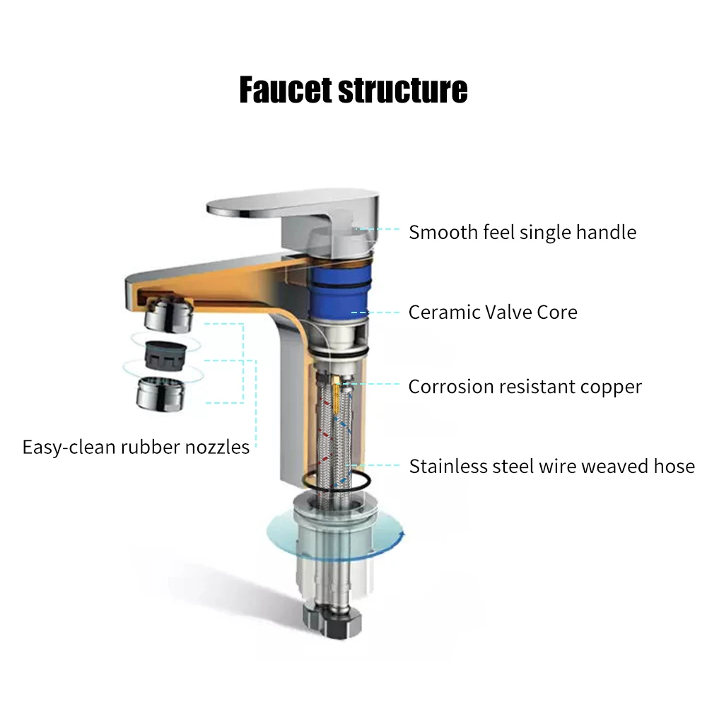 Твердый медный кран для раковины ванной комнаты устойчив к коррозии и износу, обеспечивая долговечность и надежность, двойной герметичный керамический сердечник клапана обеспечивает стабильную и герметичную работу, удобный дизайн с одной ручкой для легкого управления потоком воды, хорошо разработанный резиновый водный спрей собирает воду вместе и не брызгает, показывая гладкую воду.